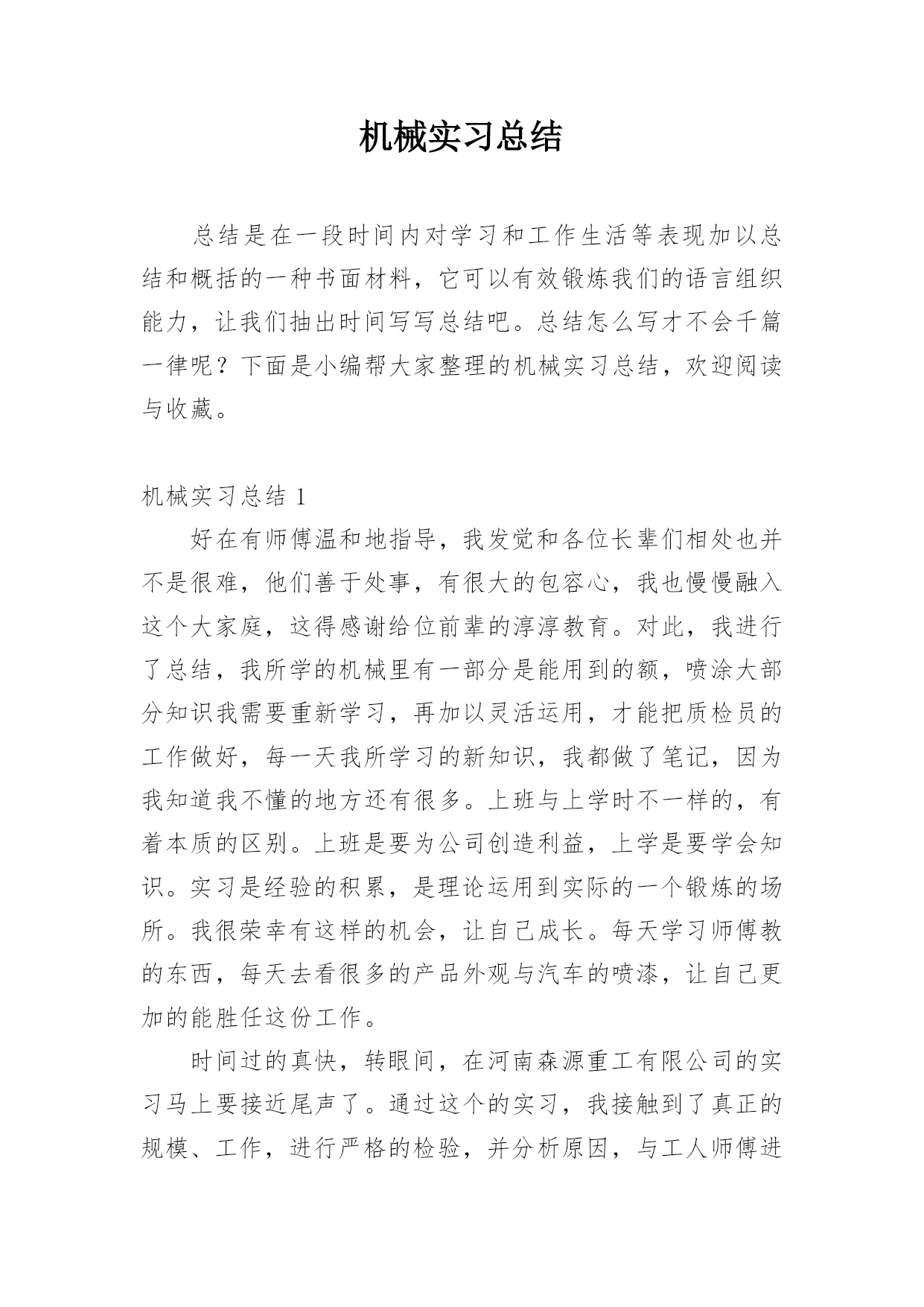 机械实习总结总结是在一段时间内对学习和工作生活等表现加以总结和概括的一种书面材料,它可以有效锻炼我们的语言组织能力,让我们抽出时间写写总结吧。总结怎么写才不会千篇一律呢?下面是小编帮大家整理的机械实习总结,欢迎阅读与收藏。机械实习总结1好在有师傅温和地指导,我发觉和各位长辈们相处也并不是很难,他们善于处事,有很大的包容心,我也慢慢融入这个大家庭,这得感谢给位前辈的淳淳教育。对此,我进行了总结,我所学的机械里有一部分是能用到的额,喷涂大部分知识我需要重新学习,再加以灵活运用,才能把质检员的工作做好,每一天我