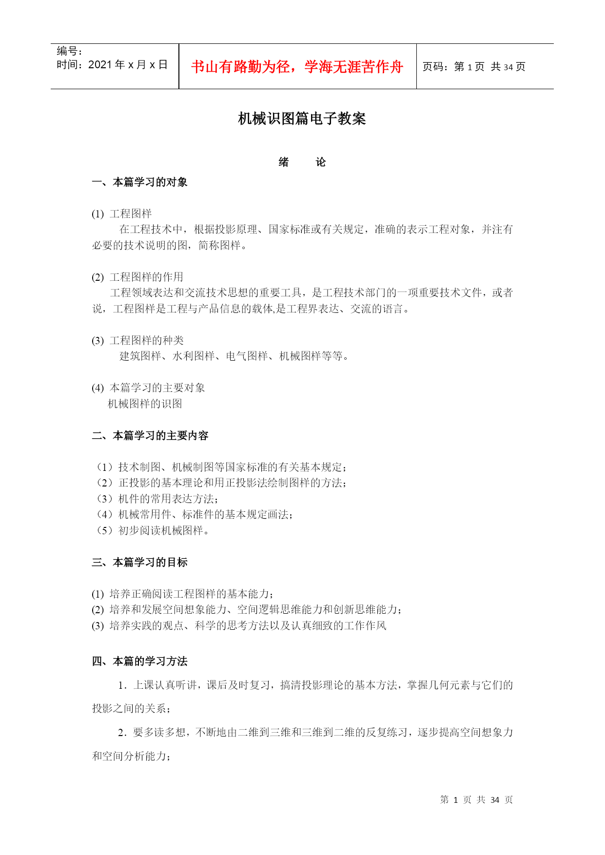 编号:时间:2021年x月x日书山有路勤为径,学海无涯苦作舟页码:第PAGE34页共NUMPAGES34页第PAGE\*MERGEFORMAT34页共NUMPAGES\*MERGEFORMAT34页机械识图篇电子教案绪论一、本篇学习的对象(1)工程图样在工程技术中,根据投影原理、国家标准或有关规定,准确的表示工程对象,并注有必要的技术说明的图,简称图样。(2)工程图样的作用工程领域表达和交流技术思想的重要工具,是工程技术部门的一项重要技术文件,或者说,工程图样是工程与产品信息的载体