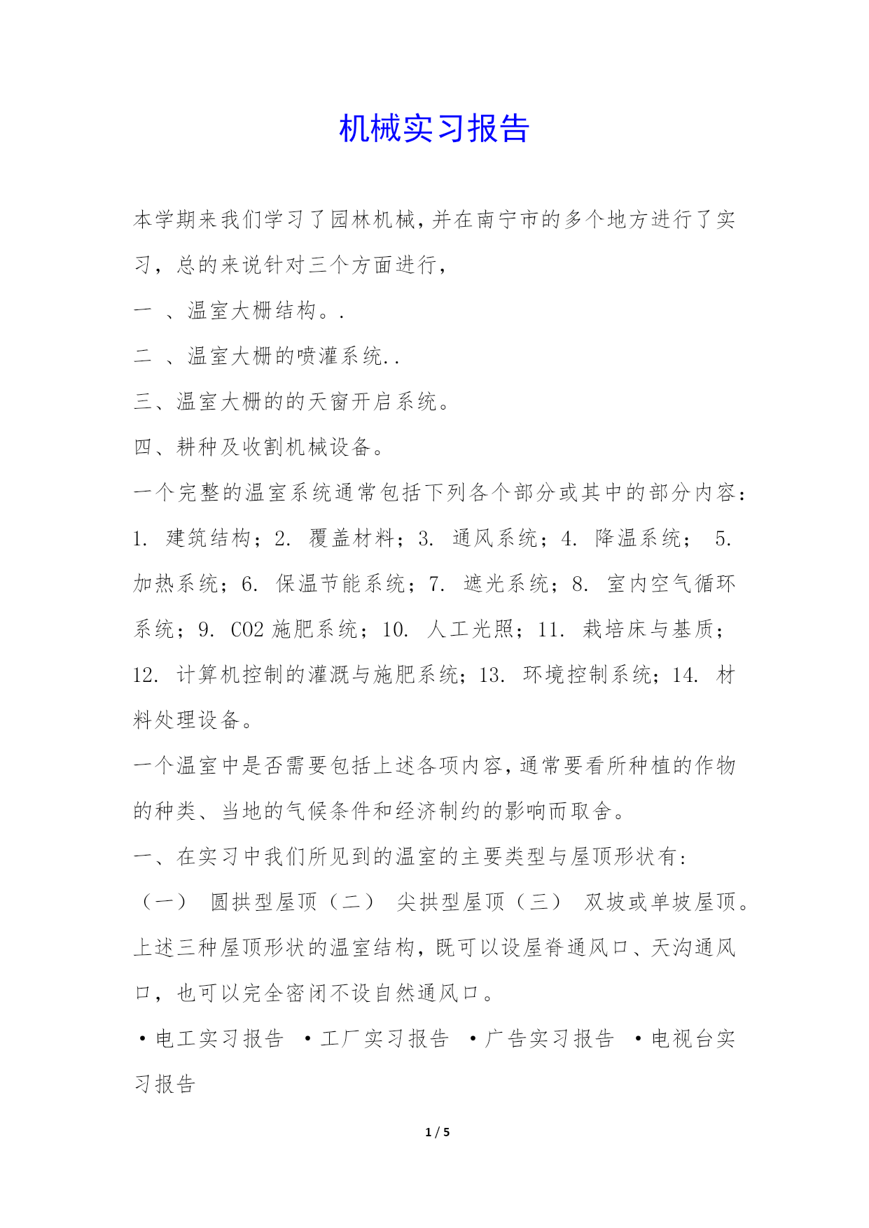 PAGE5/NUMPAGES5机械实习报告本学期来我们学习了园林机械,并在南宁市的多个地方进行了实习,总的来说针对三个方面进行,一、温室大栅结构。.二、温室大栅的喷灌系统..三、温室大栅的的天窗开启系统。四、耕种及收割机械设备。一个完整的温室系统通常包括下列各个部分或其中的部分内容:1.建筑结构;2.覆盖材料;3.通风系统;4.降温系统;5.加热系统;6.保温节能系统;7.遮光系统;8.室内空气循环系统;9.CO2施肥系统;10.人工光照;11.栽培床与基质;12.计算机控制的灌溉与施肥系统;