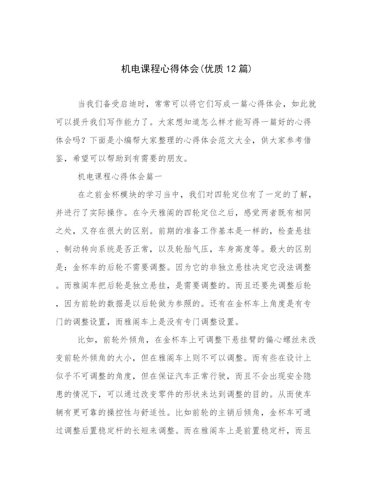 机电课程心得体会(优质12篇)当我们备受启迪时,常常可以将它们写成一篇心得体会,如此就可以提升我们写作能力了。大家想知道怎么样才能写得一篇好的心得体会吗?下面是小编帮大家整理的心得体会范文大全,供大家参考借鉴,希望可以帮助到有需要的朋友。机电课程心得体会篇一在之前金杯模块的学习当中,我们对四轮定位有了一定的了解,并进行了实际操作。在今天雅阁的四轮定位之后,感觉两者既有相同之处,又存在很大的区别。前期的准备工作基本是一样的,检查悬挂、制动转向系统是否正常,以及轮胎气压,车身高度等。最大的区别是:金杯车的后轮