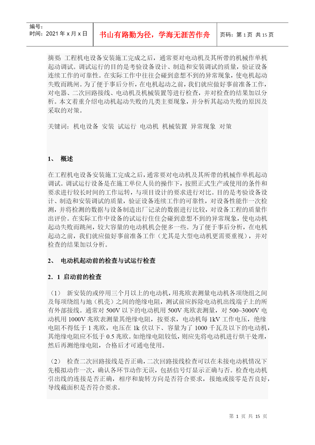 编号:时间:2021年x月x日书山有路勤为径,学海无涯苦作舟页码:第PAGE15页共NUMPAGES15页第PAGE\*MERGEFORMAT15页共NUMPAGES\*MERGEFORMAT15页摘要:工程机电设备安装施工完成之后,通常要对电动机及其所带的机械作单机起动调试。调试运行的目的是考验设备设计、制造和安装调试的质量,验证设备连续工作的可靠性。在实际工作中往往会碰到意想不到的异常现象,使电机起动失败而跳闸。为了便于事后HYPERLINK"http://www.studa