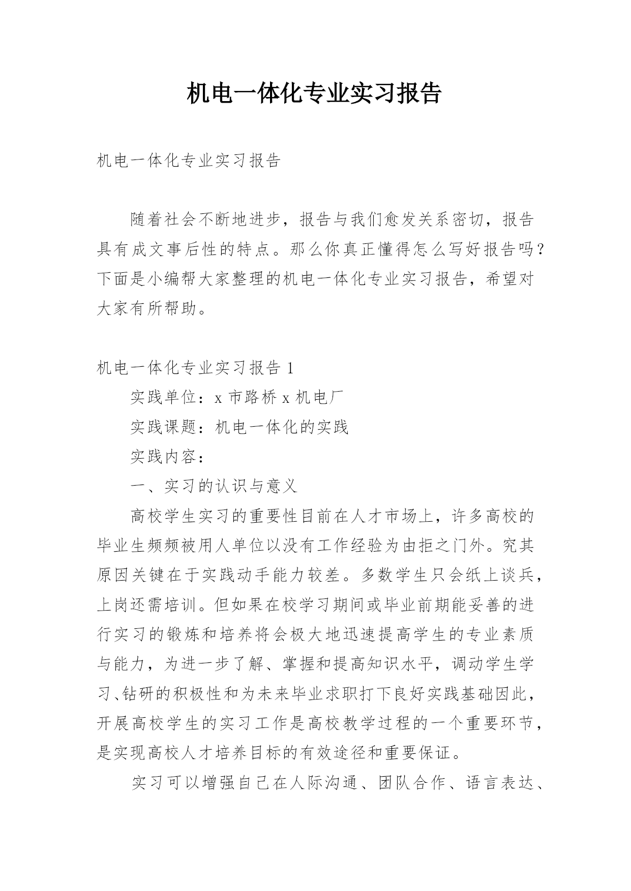 机电一体化专业实习报告机电一体化专业实习报告随着社会不断地进步,报告与我们愈发关系密切,报告具有成文事后性的特点。那么你真正懂得怎么写好报告吗?下面是小编帮大家整理的机电一体化专业实习报告,希望对大家有所帮助。机电一体化专业实习报告1实践单位:x市路桥x机电厂实践课题:机电一体化的实践实践内容:一、实习的认识与意义高校学生实习的重要性目前在人才市场上,许多高校的毕业生频频被用人单位以没有工作经验为由拒之门外。究其原因关键在于实践动手能力较差。多数学生只会纸上谈兵,上岗还需培训。但如果在校学习期间或毕业前期