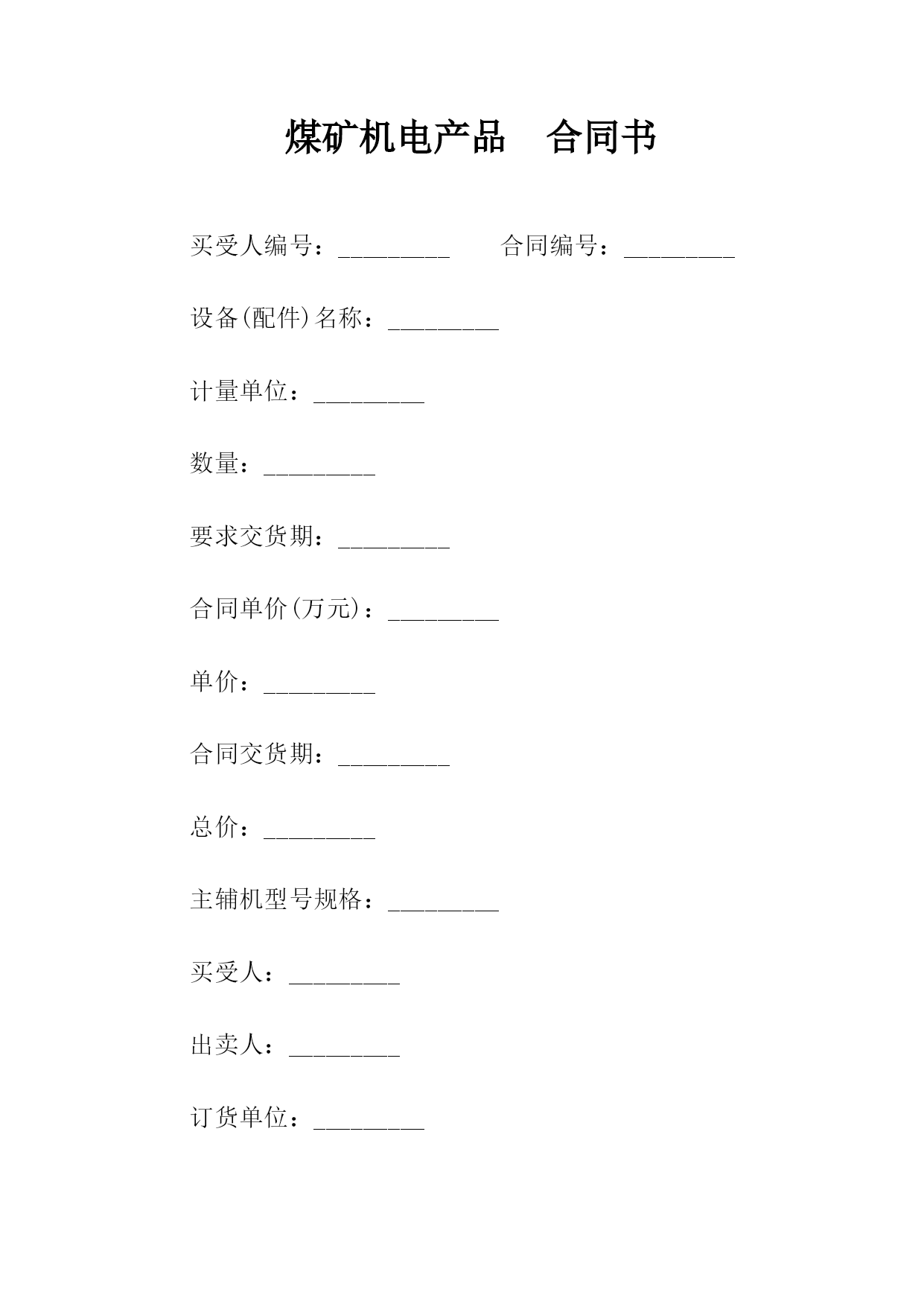 煤矿机电产品合同书买受人编号:_________合同编号:_________设备(配件)名称:_________计量单位:_________数量:_________要求交货期:_________合同单价(万元):_________单价:_________合同交货期:_________总价:_________主辅机型号规格:_________买受人:_________出卖人:_________订货单位:_________供货单位:_________单项工程:_________通讯地址:_________帐号