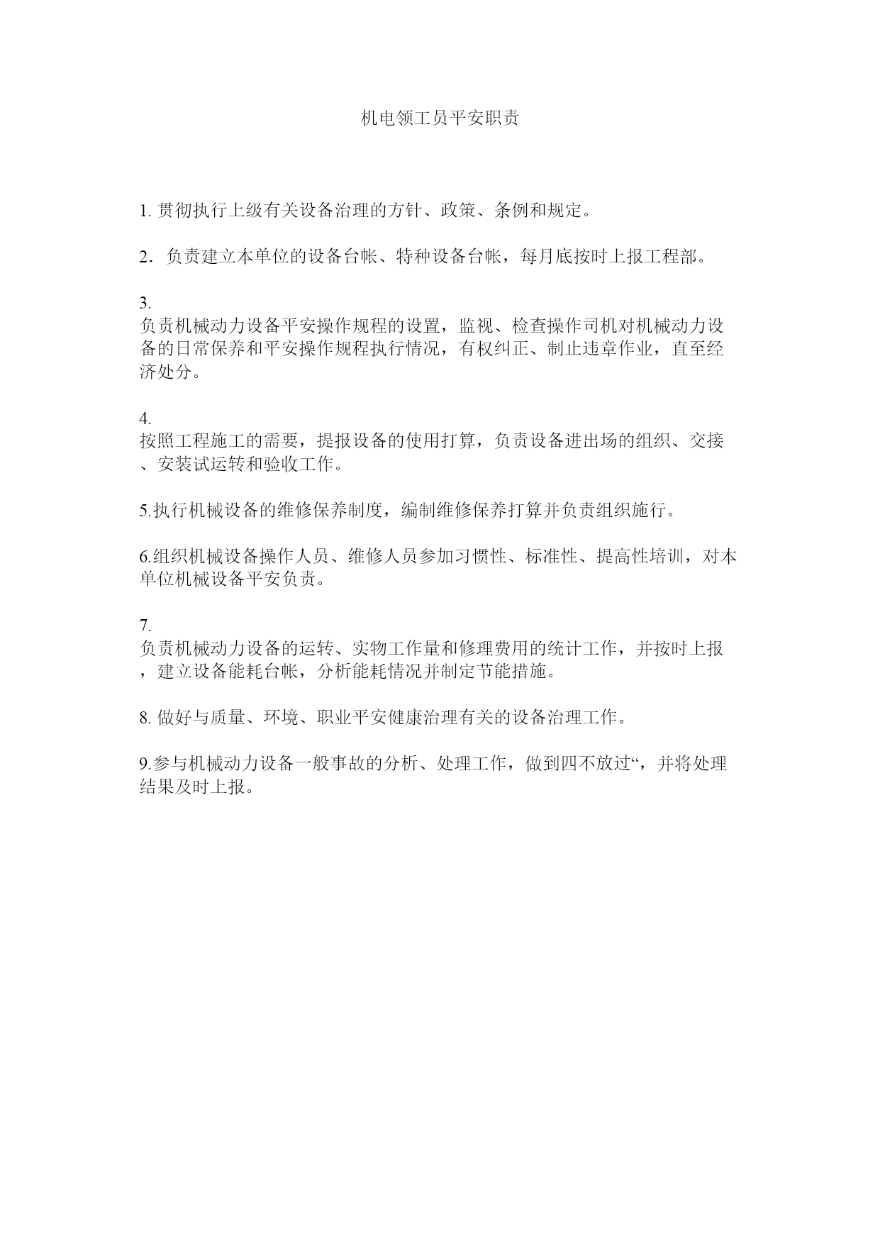 机电领工员平安职责1.贯彻执行上级有关设备治理的方针、政策、条例和规定。2.负责建立本单位的设备台帐、特种设备台帐,每月底按时上报工程部。3.负责机械动力设备平安操作规程的设置,监视、检查操作司机对机械动力设备的日常保养和平安操作规程执行情况,有权纠正、制止违章作业,直至经济处分。4.按照工程施工的需要,提报设备的使用打算,负责设备进出场的组织、交接、安装试运转和验收工作。5.执行机械设备的维修保养制度,编制维修保养打算并负责组织施行。6.组织机械设备操作人员、维修人员参加习惯性、标准性、提高性培训,对本
