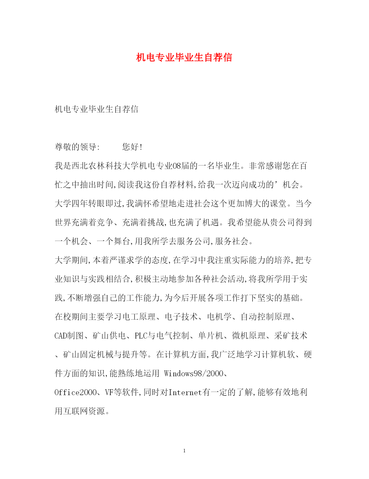 此资料由网络收集而来,如有侵权请告知上传者立即删除。资料共分享,我们负责传递知识。PAGEPAGE2机电专业毕业生自荐信机电专业毕业生自荐信尊敬的领导:您好!我是西北农林科技大学机电专业08届的一名毕业生。非常感谢您在百忙之中抽出时间,阅读我这份自荐材料,给我一次迈向成功的’机会。大学四年转眼即过,我满怀希望地走进社会这个更加博大的课堂。当今世界充满着竞争、充满着挑战,也充满了机遇。我希望能从贵公司得到一个机会、一个舞台,用我所学去服务公司,服务社会。大学期间,本着严谨求学的态度,在学习中我注