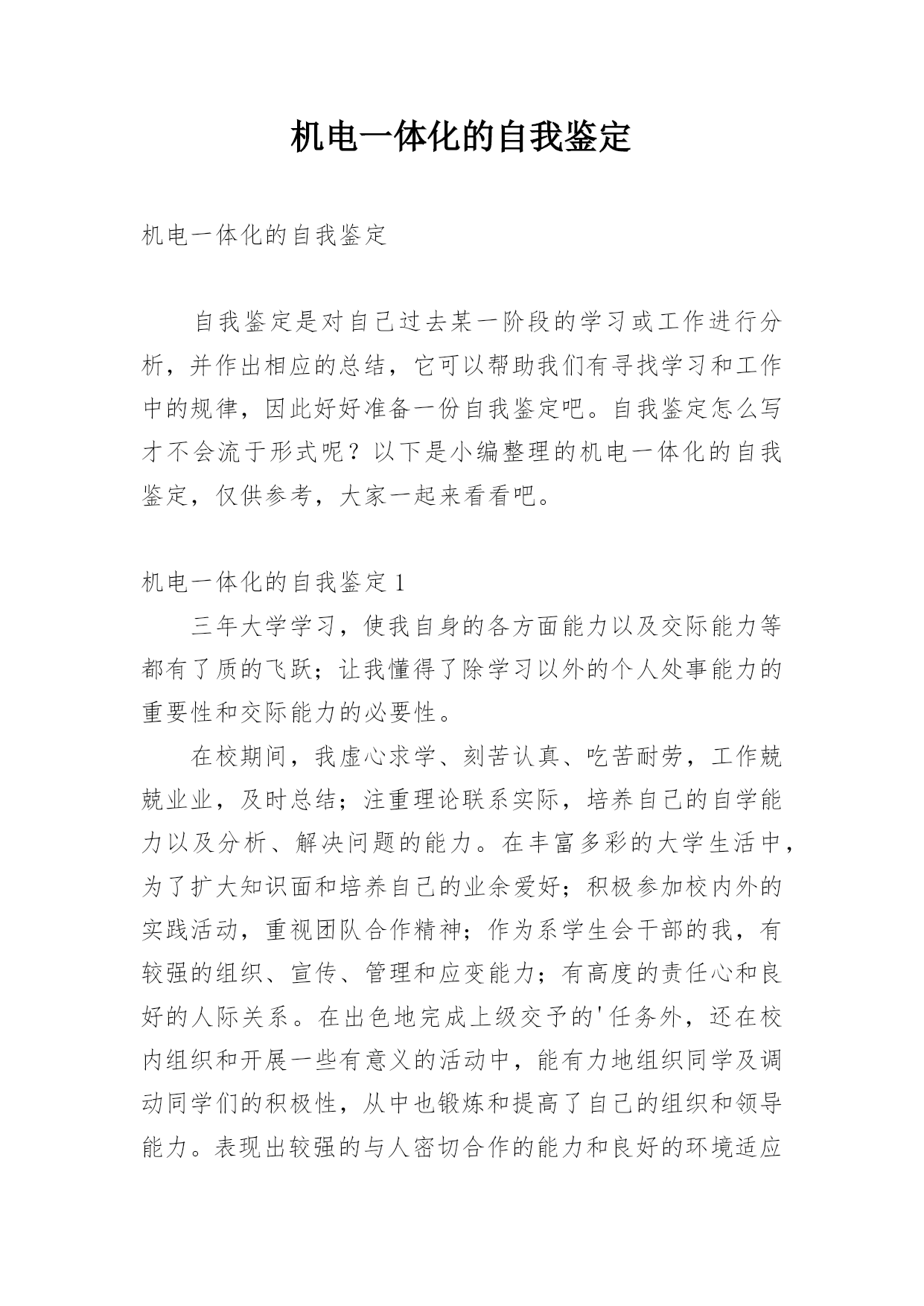 机电一体化的自我鉴定机电一体化的自我鉴定自我鉴定是对自己过去某一阶段的学习或工作进行分析,并作出相应的总结,它可以帮助我们有寻找学习和工作中的规律,因此好好准备一份自我鉴定吧。自我鉴定怎么写才不会流于形式呢?以下是小编整理的机电一体化的自我鉴定,仅供参考,大家一起来看看吧。机电一体化的自我鉴定1三年大学学习,使我自身的各方面能力以及交际能力等都有了质的飞跃;让我懂得了除学习以外的个人处事能力的重要性和交际能力的必要性。在校期间,我虚心求学、刻苦认真、吃苦耐劳,工作兢兢业业,及时总结;注重理论联系实际,培养