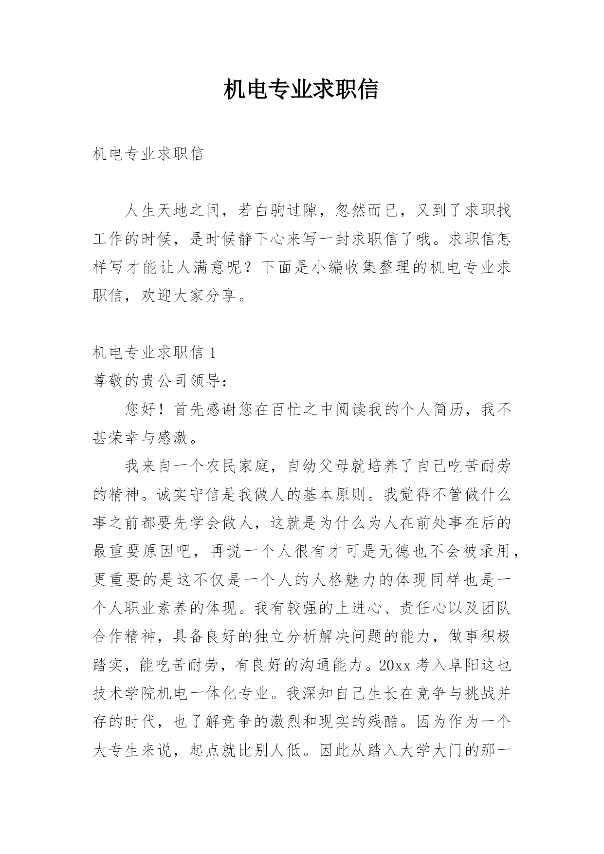 机电专业求职信机电专业求职信人生天地之间,若白驹过隙,忽然而已,又到了求职找工作的时候,是时候静下心来写一封求职信了哦。求职信怎样写才能让人满意呢?下面是小编收集整理的机电专业求职信,欢迎大家分享。机电专业求职信1尊敬的贵公司领导:您好!首先感谢您在百忙之中阅读我的个人简历,我不甚荣幸与感激。我来自一个农民家庭,自幼父母就培养了自己吃苦耐劳的精神。诚实守信是我做人的基本原则。我觉得不管做什么事之前都要先学会做人,这就是为什么为人在前处事在后的最重要原因吧,再说一个人很有才可是无德也不会被录用,更重要的是这