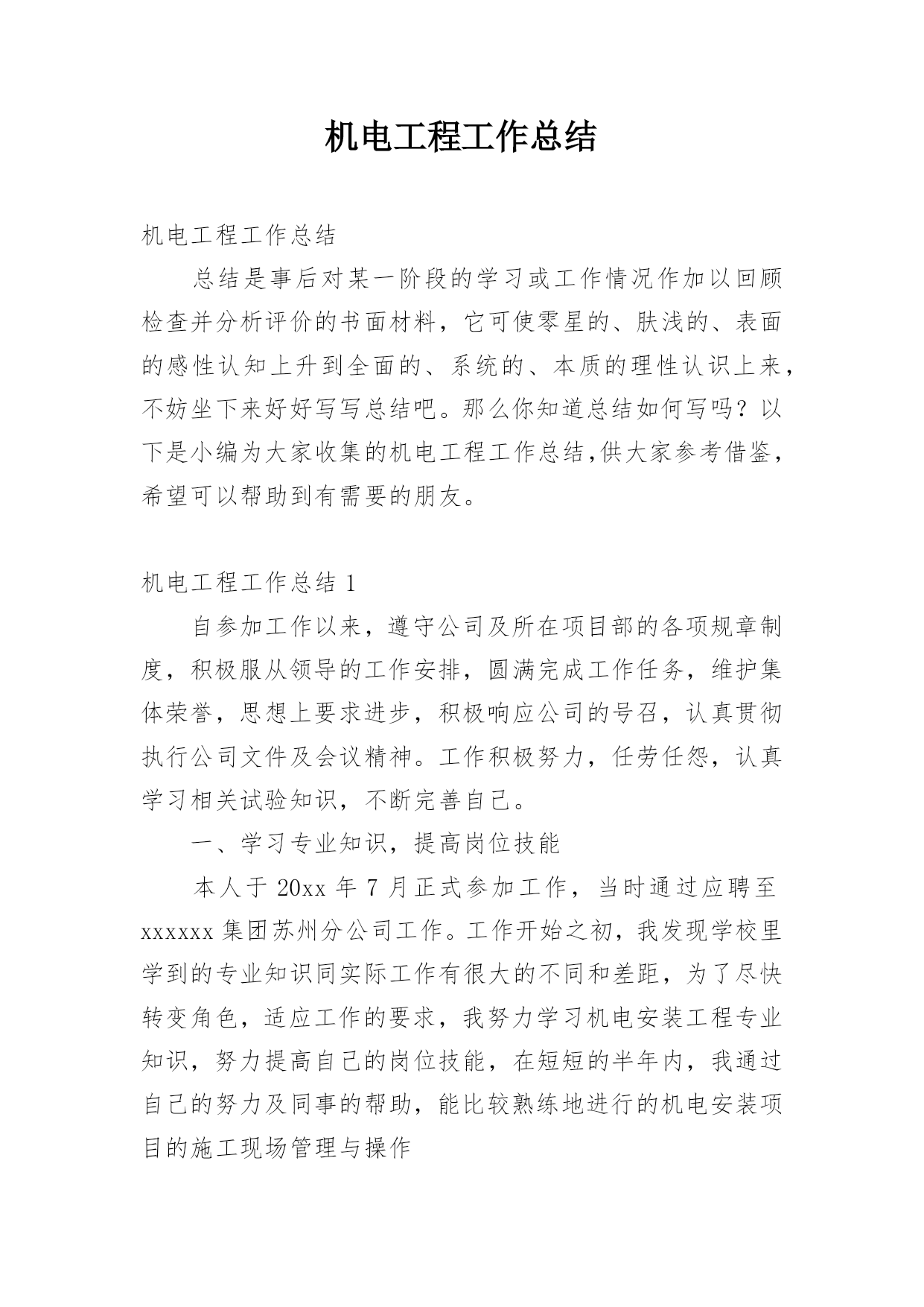 机电工程工作总结机电工程工作总结总结是事后对某一阶段的学习或工作情况作加以回顾检查并分析评价的书面材料,它可使零星的、肤浅的、表面的感性认知上升到全面的、系统的、本质的理性认识上来,不妨坐下来好好写写总结吧。那么你知道总结如何写吗?以下是小编为大家收集的机电工程工作总结,供大家参考借鉴,希望可以帮助到有需要的朋友。机电工程工作总结1自参加工作以来,遵守公司及所在项目部的各项规章制度,积极服从领导的工作安排,圆满完成工作任务,维护集体荣誉,思想上要求进步,积极响应公司的号召,认真贯彻执行公司文件及会议精神。