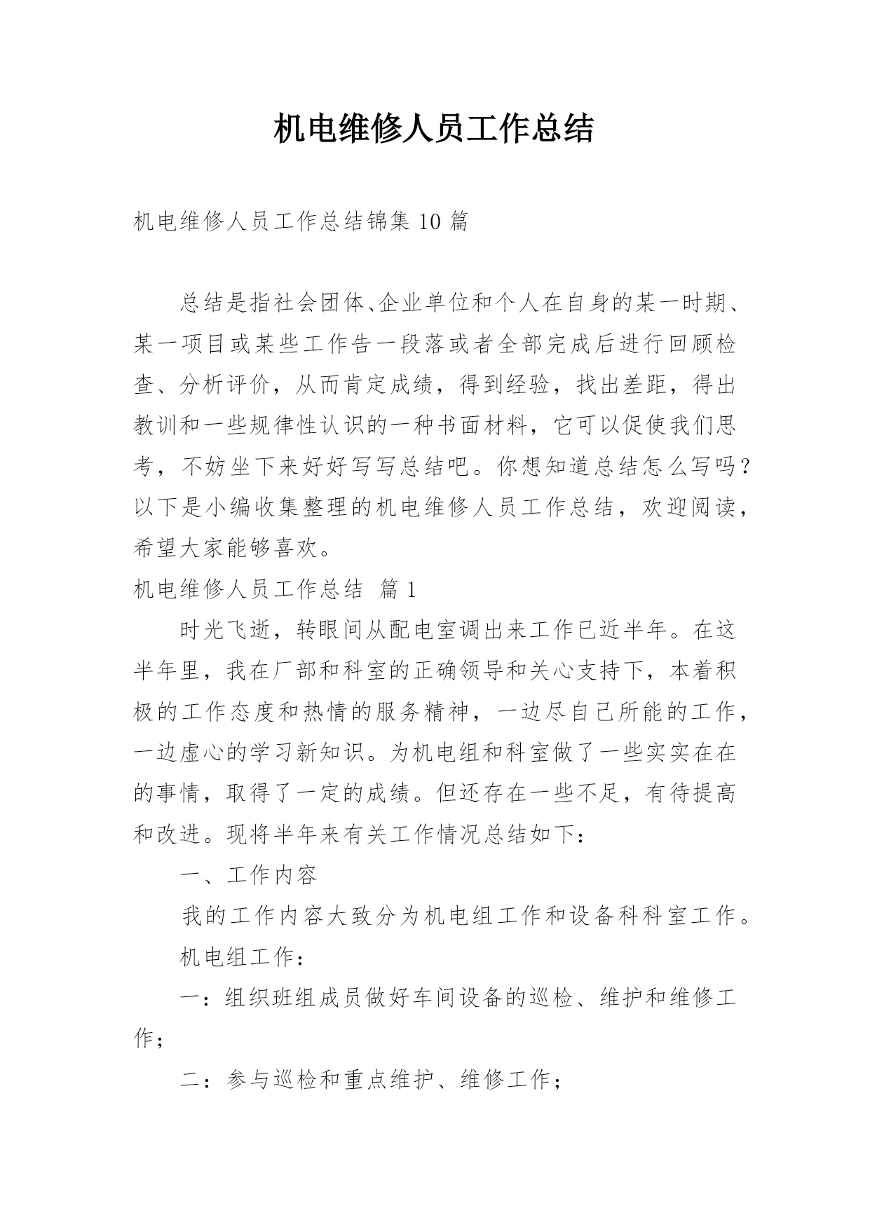 机电维修人员工作总结机电维修人员工作总结锦集10篇总结是指社会团体、企业单位和个人在自身的某一时期、某一项目或某些工作告一段落或者全部完成后进行回顾检查、分析评价,从而肯定成绩,得到经验,找出差距,得出教训和一些规律性认识的一种书面材料,它可以促使我们思考,不妨坐下来好好写写总结吧。你想知道总结怎么写吗?以下是小编收集整理的机电维修人员工作总结,欢迎阅读,希望大家能够喜欢。机电维修人员工作总结篇1时光飞逝,转眼间从配电室调出来工作已近半年。在这半年里,我在厂部和科室的正确领导和关心支持下,本着积极的工作态