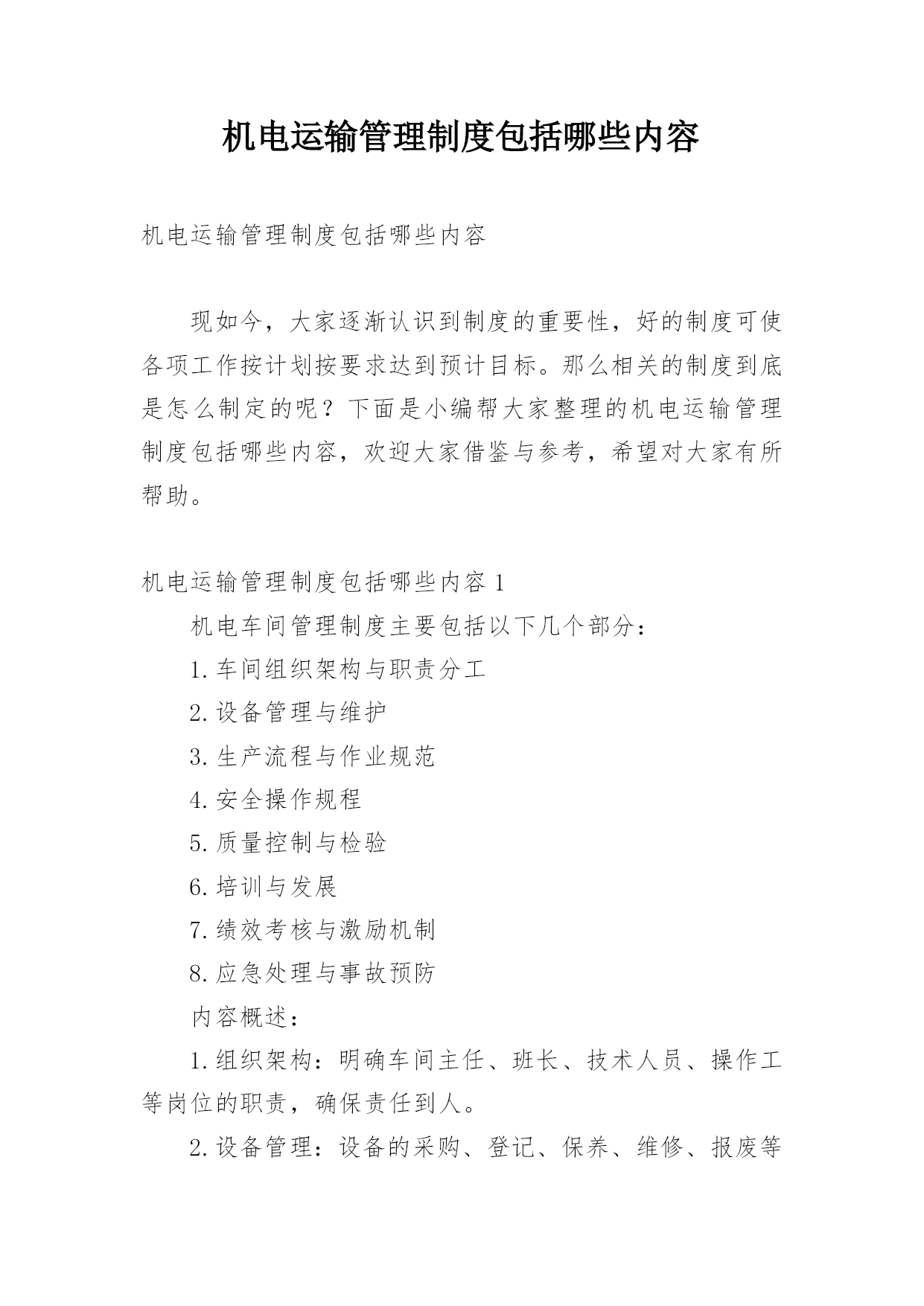 机电运输管理制度包括哪些内容机电运输管理制度包括哪些内容现如今,大家逐渐认识到制度的重要性,好的制度可使各项工作按计划按要求达到预计目标。那么相关的制度到底是怎么制定的呢?下面是小编帮大家整理的机电运输管理制度包括哪些内容,欢迎大家借鉴与参考,希望对大家有所帮助。机电运输管理制度包括哪些内容1机电车间管理制度主要包括以下几个部分:1.车间组织架构与职责分工2.设备管理与维护3.生产流程与作业规范4.安全操作规程5.质量控制与检验6.培训与发展7.绩效考核与激励机制8.应急处理与事故预防内容概述:1.组织架