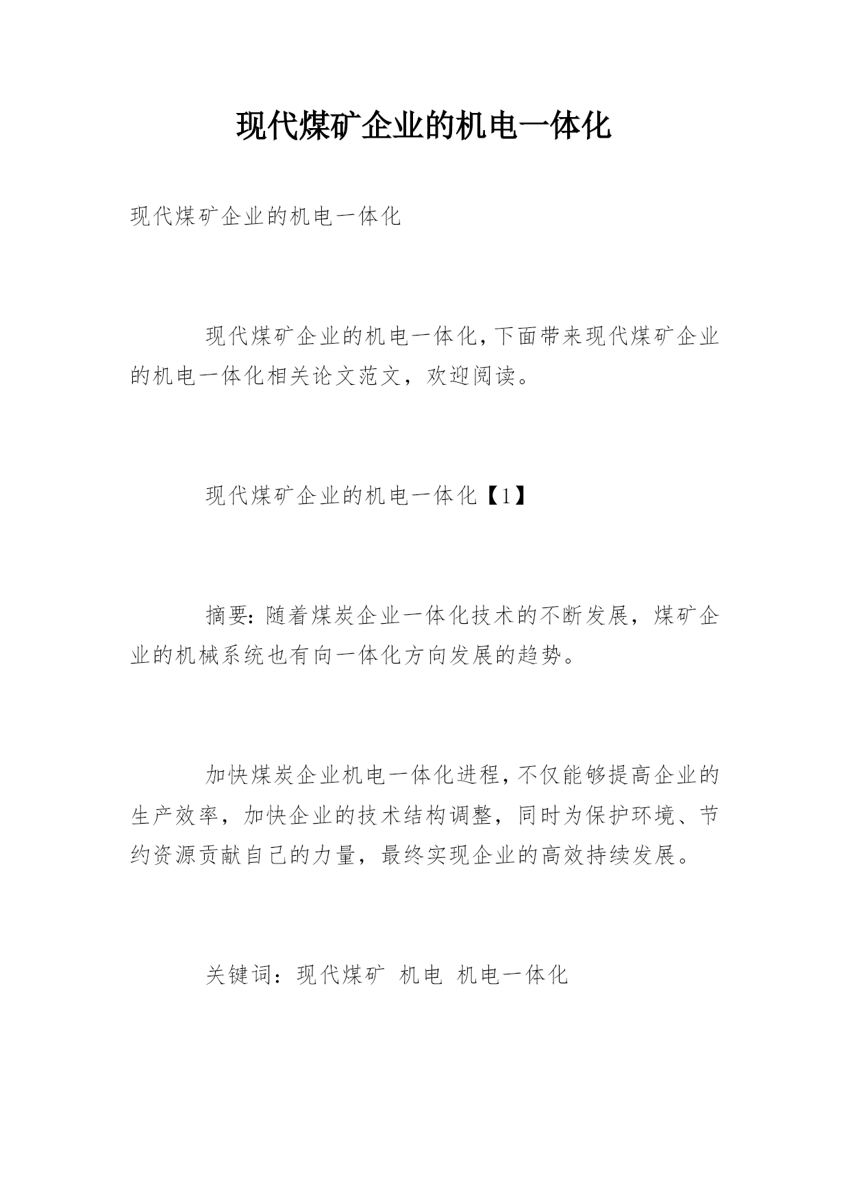 现代煤矿企业的机电一体化现代煤矿企业的机电一体化现代煤矿企业的机电一体化,下面带来现代煤矿企业的机电一体化相关论文范文,欢迎阅读。现代煤矿企业的机电一体化【1】摘要:随着煤炭企业一体化技术的不断发展,煤矿企业的机械系统也有向一体化方向发展的趋势。加快煤炭企业机电一体化进程,不仅能够提高企业的生产效率,加快企业的技术结构调整,同时为保护环境、节约资源贡献自己的力量,最终实现企业的高效持续发展。关键词:现代煤矿机电机电一体化0引言机电一体化(机械电子工程学科)是以微电子技术为核心的高新技术的兴起而得到快速发展