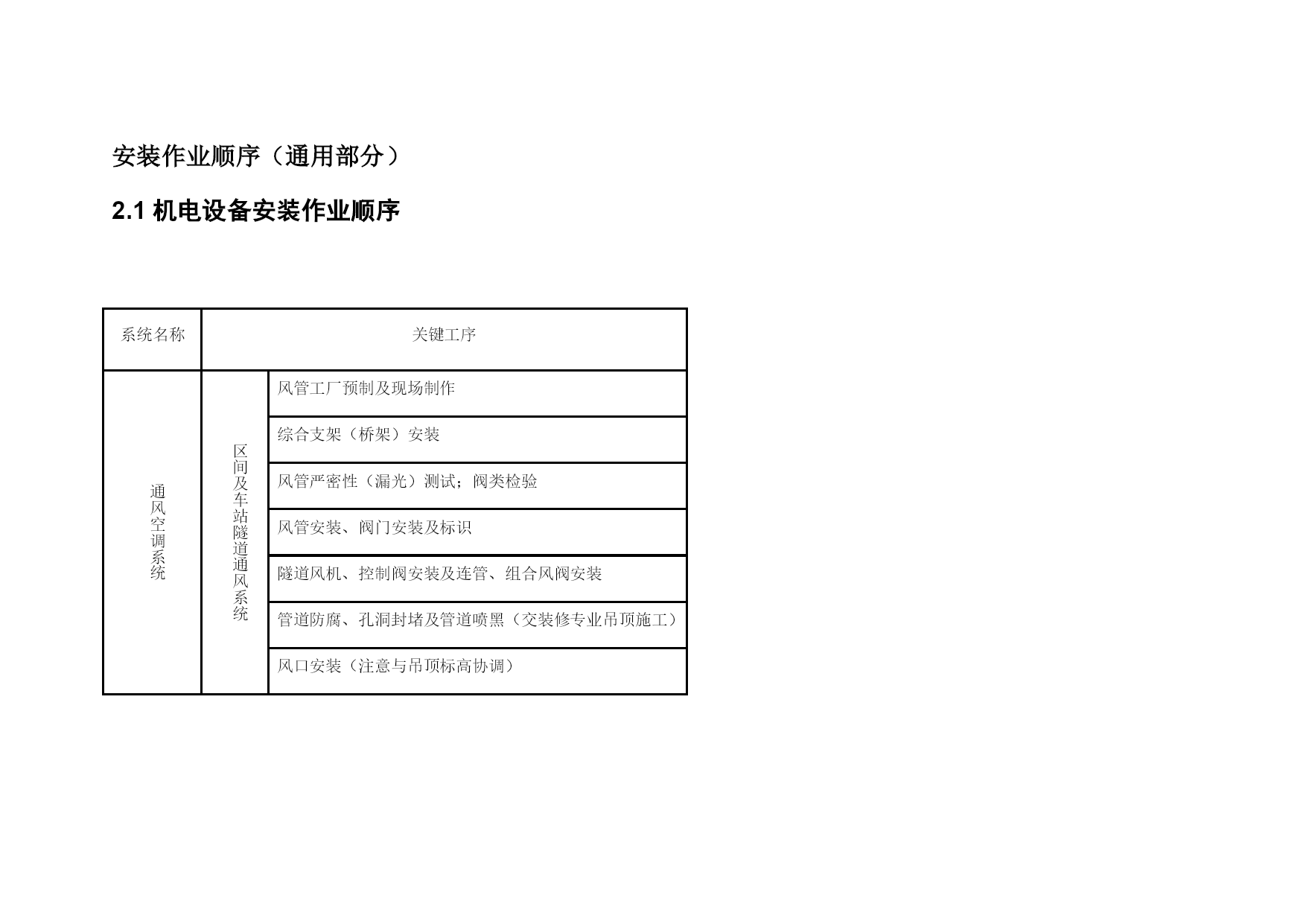 安装作业顺序(通用部分)2.1机电设备安装作业顺序系统名称关键工序通风空调系统区间及车站隧道通风系统风管工厂预制及现场制作综合支架(桥架)安装风管严密性(漏光)测试;阀类检验风管安装、阀门安装及标识隧道风机、控制阀安装及连管、组合风阀安装管道防腐、孔洞封堵及管道喷黑(交装修专业吊顶施工)风口安装(注意与吊顶标高协调)系统名称关键工序通风空调系统车站通风空调大、小系统及冷冻水系统风管、水管工厂预制及现场制作综合支架(桥架)安装风管严密性(漏光)测试;阀类检验风管安装、各类阀门安装及标识各类风机安装、控制阀安
