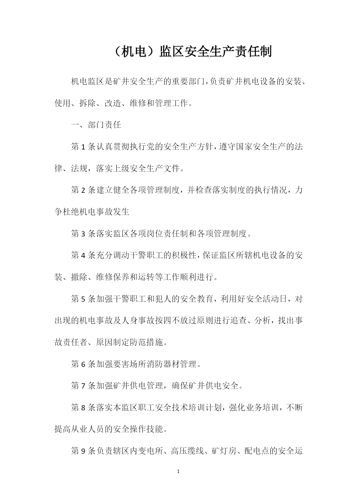 PAGEPAGE3(机电)监区安全生产责任制机电监区是矿井安全生产的重要部门,负责矿井机电设备的安装、使用、拆除、改造、维修和管理工作。一、部门责任第1条认真贯彻执行党的安全生产方针,遵守国家安全生产的法律、法规,落实上级安全生产文件。第2条建立健全各项管理制度,并检查落实制度的执行情况,力争杜绝机电事故发生第3条落实监区各项岗位责任制和各项管理制度。第4条充分调动干警职工的积极性,保证监区所辖机电设备的安装、撤除、维修保养和运转等工作顺利进行。第5条加强干警职工和犯人的安全教育,利用好安全活