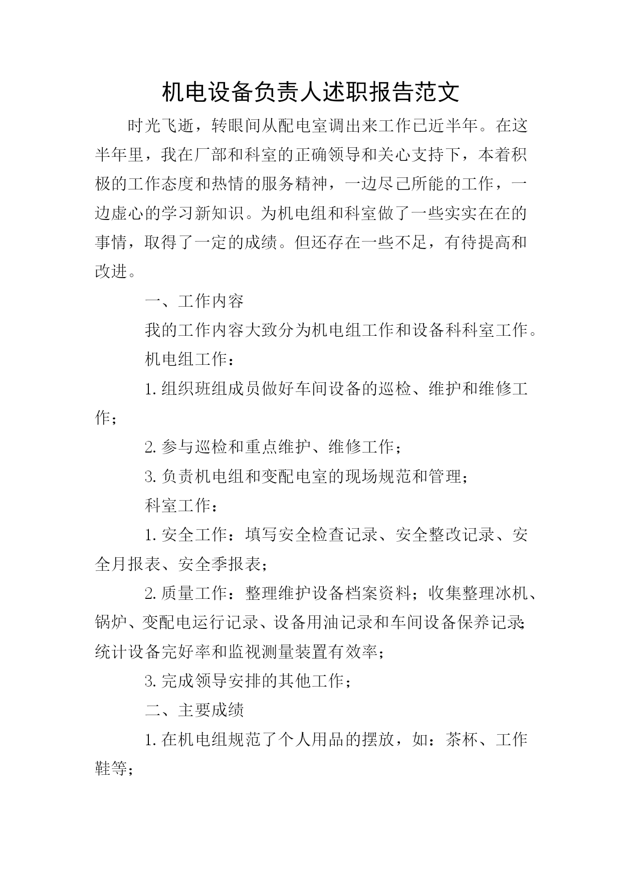 机电设备负责人述职报告范文时光飞逝,转眼间从配电室调出来工作已近半年。在这半年里,我在厂部和科室的正确领导和关心支持下,本着积极的工作态度和热情的服务精神,一边尽己所能的工作,一边虚心的学习新知识。为机电组和科室做了一些实实在在的事情,取得了一定的成绩。但还存在一些不足,有待提高和改进。一、工作内容我的工作内容大致分为机电组工作和设备科科室工作。机电组工作:1.组织班组成员做好车间设备的巡检、维护和维修工作;2.参与巡检和重点维护、维修工作;3.负责机电组和变配电室的现场规范和管理;科室工作:1.安全工作