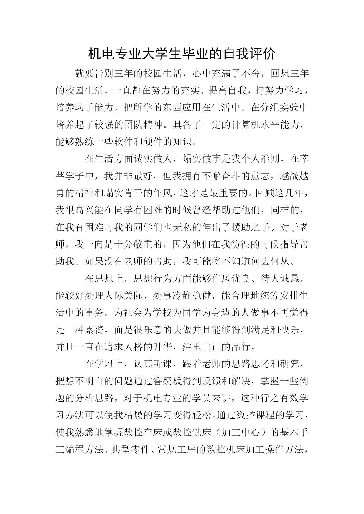 机电专业大学生毕业的自我评价就要告别三年的校园生活,心中充满了不舍,回想三年的校园生活,一直都在努力的充实、提高自我,持努力学习,培养动手能力,把所学的东西应用在生活中。在分组实验中培养起了较强的团队精神。具备了一定的计算机水平能力,能够熟练一些软件和硬件的知识。在生活方面诚实做人,塌实做事是我个人准则,在莘莘学子中,我并非最好,但我拥有不懈奋斗的意志,越战越勇的精神和塌实肯干的作风,这才是最重要的。回顾这几年,我很高兴能在同学有困难的时候曾经帮助过他们,同样的,在我有困难时我的同学们也无私的伸出了援助之