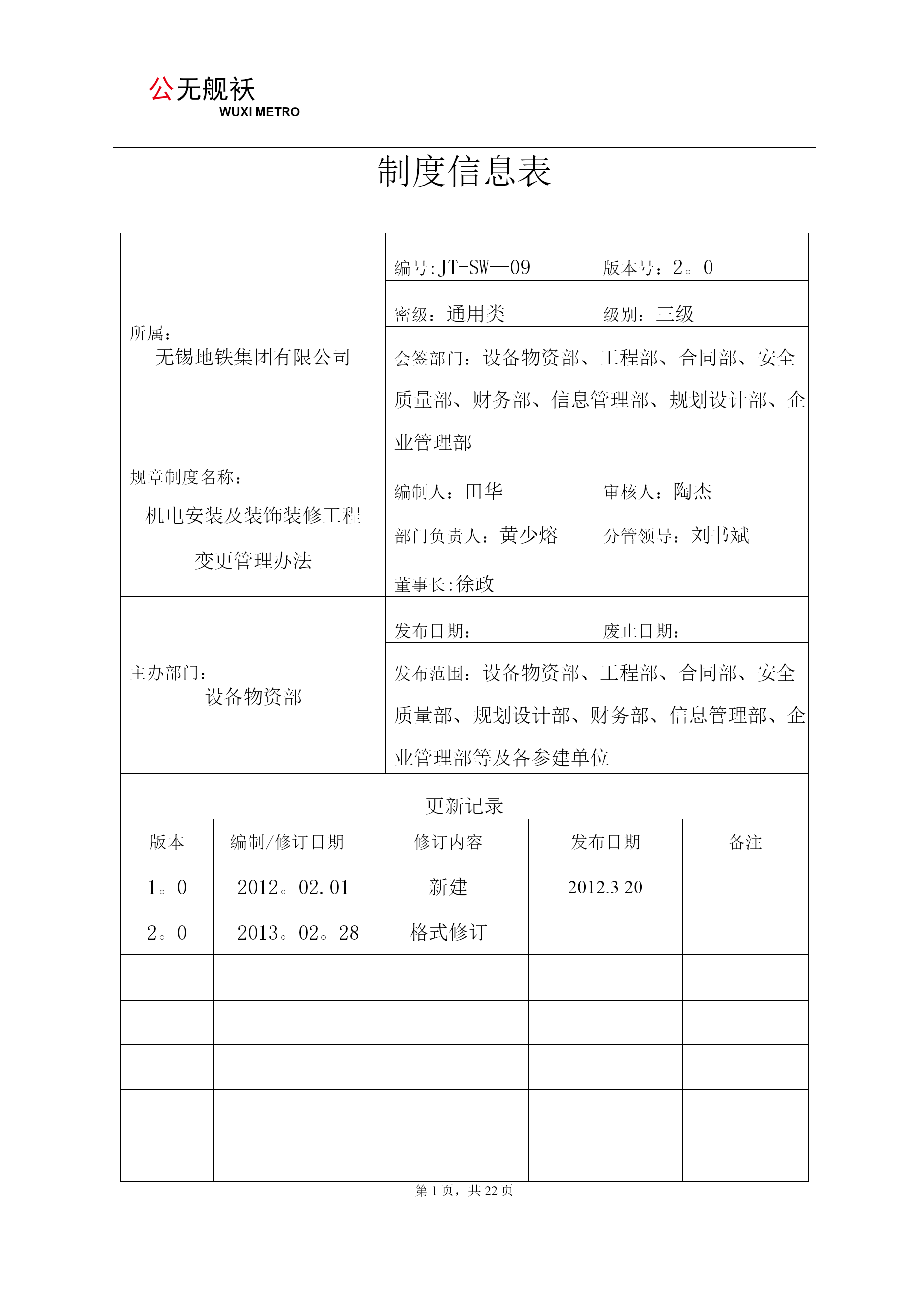 公无舰袄WUXIMETRO制度信息表所属:无锡地铁集团有限公司编号:JT-SW—09版本号:2。0密级:通用类级别:三级会签部门:设备物资部、工程部、合同部、安全质量部、财务部、信息管理部、规划设计部、企业管理部规章制度名称:机电安装及装饰装修工程变更管理办法编制人:田华审核人:陶杰部门负责人:黄少熔分管领导:刘书斌董事长:徐政主办部门:设备物资部发布日期:废止日期:发布范围:设备物资部、工程部、合同部、安全质量部、规划设计部、财务部、信息管理部、企业管理部等及各参建单位更新记录版本编制/修订日期修订内容