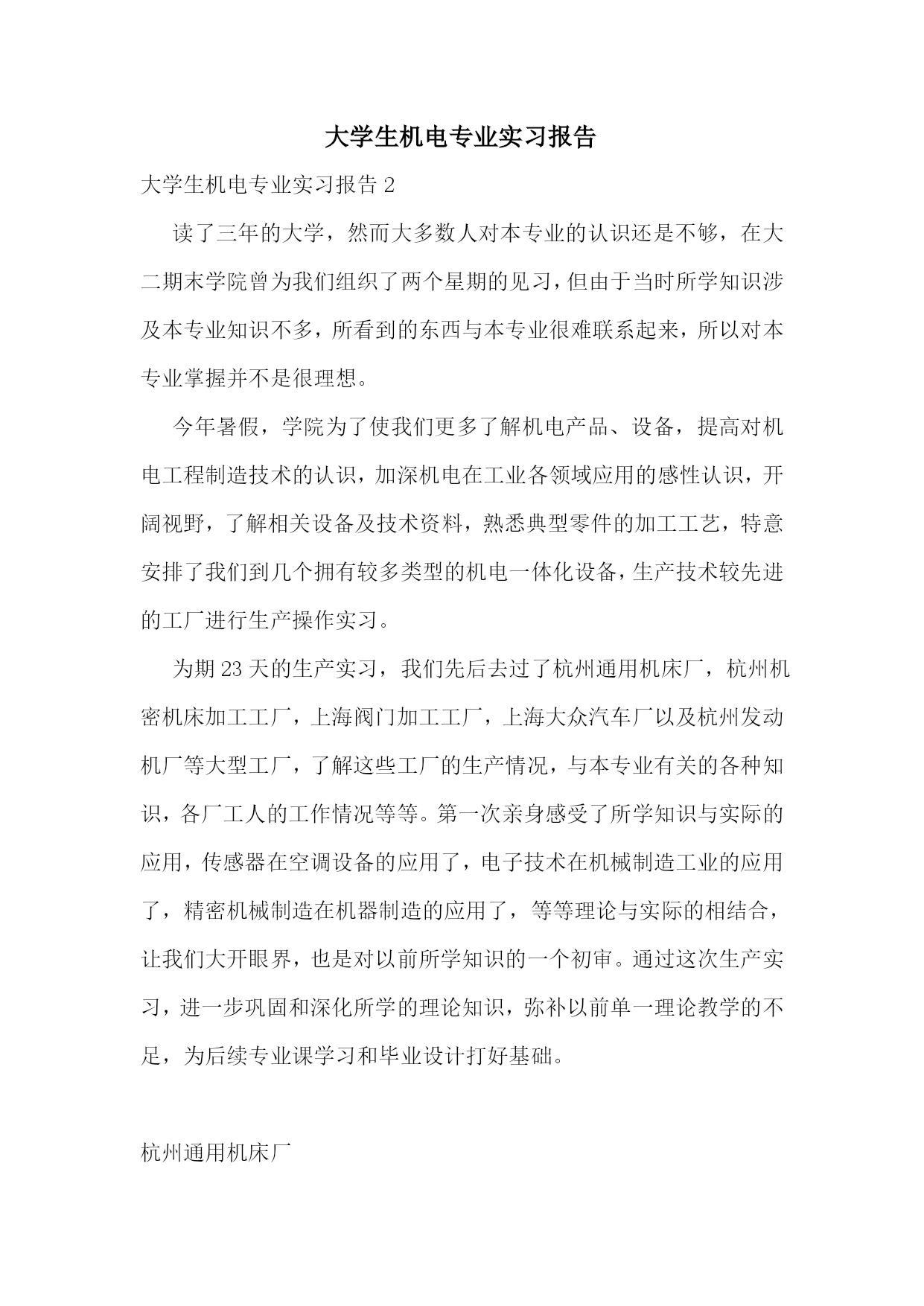 大学生机电专业实习报告大学生机电专业实习报告2读了三年的大学,然而大多数人对本专业的认识还是不够,在大二期末学院曾为我们组织了两个星期的见习,但由于当时所学知识涉及本专业知识不多,所看到的东西与本专业很难联系起来,所以对本专业掌握并不是很理想。今年暑假,学院为了使我们更多了解机电产品、设备,提高对机电工程制造技术的认识,加深机电在工业各领域应用的感性认识,开阔视野,了解相关设备及技术资料,熟悉典型零件的加工工艺,特意安排了我们到几个拥有较多类型的机电一体化设备,生产技术较先进的工厂进行生产操作实习。为期2