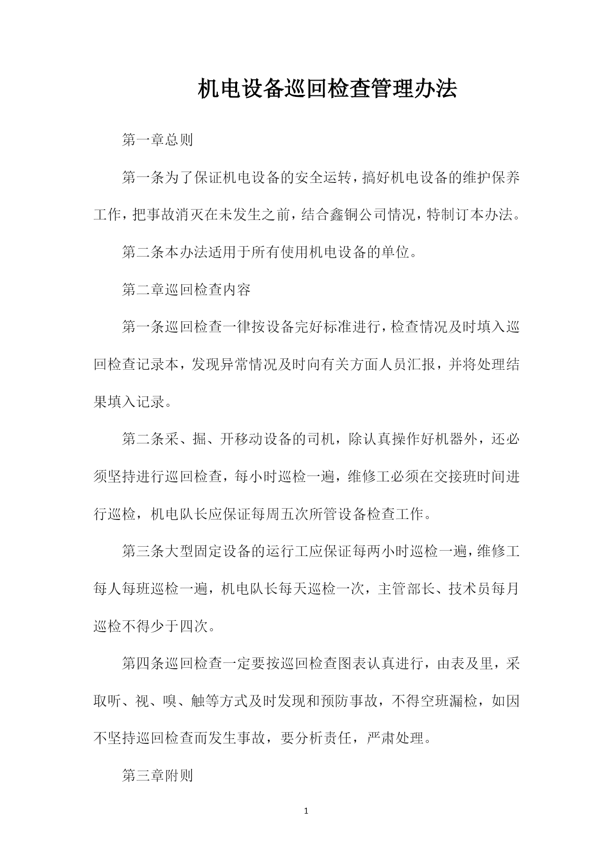 PAGEPAGE2机电设备巡回检查管理办法第一章总则第一条为了保证机电设备的安全运转,搞好机电设备的维护保养工作,把事故消灭在未发生之前,结合鑫铜公司情况,特制订本办法。第二条本办法适用于所有使用机电设备的单位。第二章巡回检查内容第一条巡回检查一律按设备完好标准进行,检查情况及时填入巡回检查记录本,发现异常情况及时向有关方面人员汇报,并将处理结果填入记录。第二条采、掘、开移动设备的司机,除认真操作好机器外,还必须坚持进行巡回检查,每小时巡检一遍,维修工必须在交接班时间进行巡检,机电队长应保证每