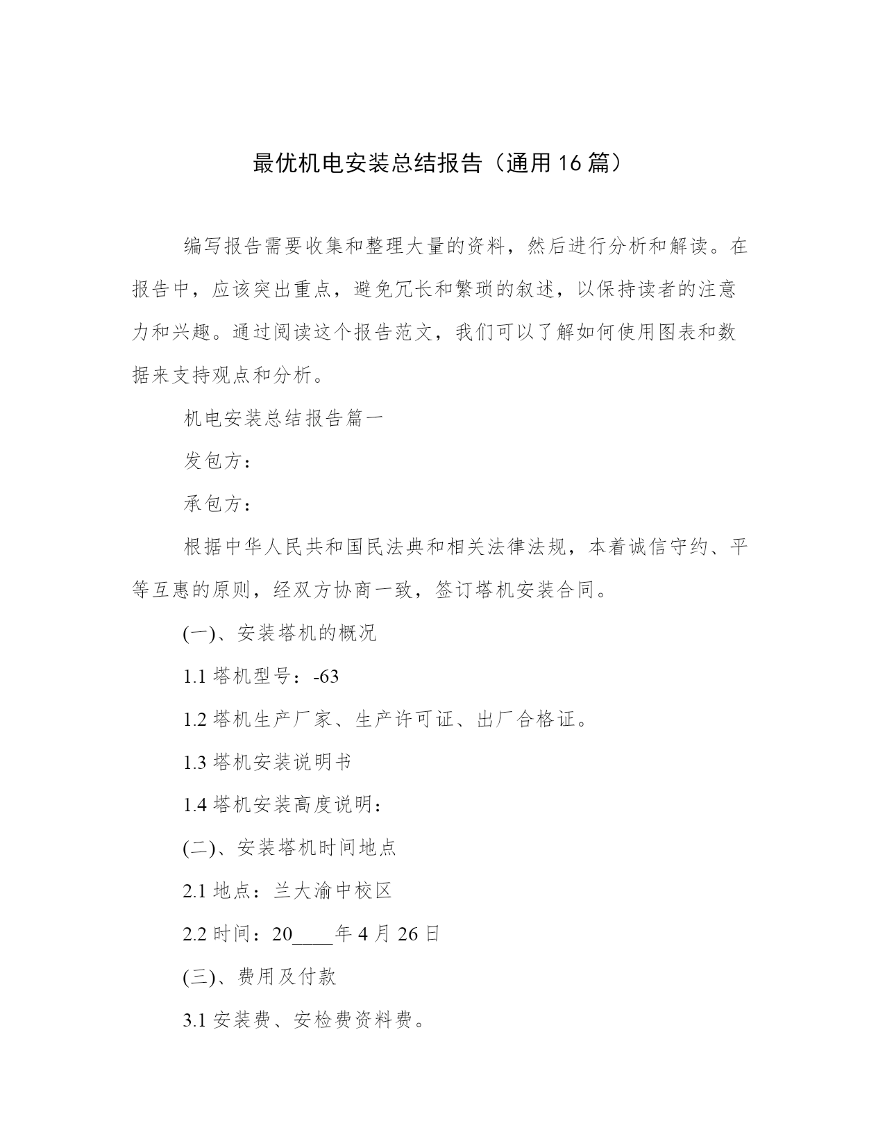 最优机电安装总结报告(通用16篇)编写报告需要收集和整理大量的资料,然后进行分析和解读。在报告中,应该突出重点,避免冗长和繁琐的叙述,以保持读者的注意力和兴趣。通过阅读这个报告范文,我们可以了解如何使用图表和数据来支持观点和分析。机电安装总结报告篇一发包方:承包方:根据中华人民共和国民法典和相关法律法规,本着诚信守约、平等互惠的原则,经双方协商一致,签订塔机安装合同。(一)、安装塔机的概况1.1塔机型号:-631.2塔机生产厂家、生产许可证、出厂合格证。1.3塔机安装说明书1.4塔机安装高度说明:(二)、