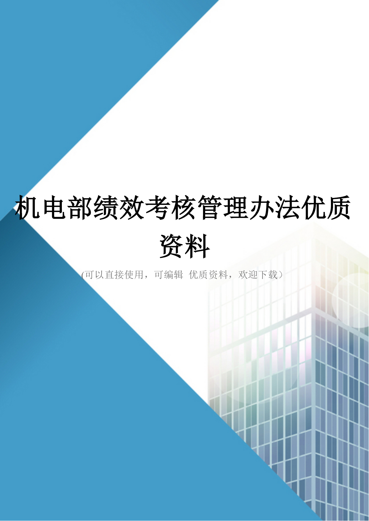 机电部绩效考核管理办法优质资料(可以直接使用,可编辑优质资料,欢迎下载)机电部员工承包绩效考核管理办法为进一步提高机电部员工个人素质和能力,充分调动全体员工工作主动性和积极性,推行机电部部主任承包负责制,岗位责任落实到人,岗位承包落实到区队,运作市场化管理机制,在部室内部营造公平、公正、公开竞争机制,规范员工晋升、晋级工作流程,特制定本制度。一、机电运营部运行模式根据公司生产经营管理运作方式要求,执行“主任承包负责制”,统一经营运作部室管理。二、岗位设置及人员职责机电运营部岗位职责序号姓名职务专业区域主要