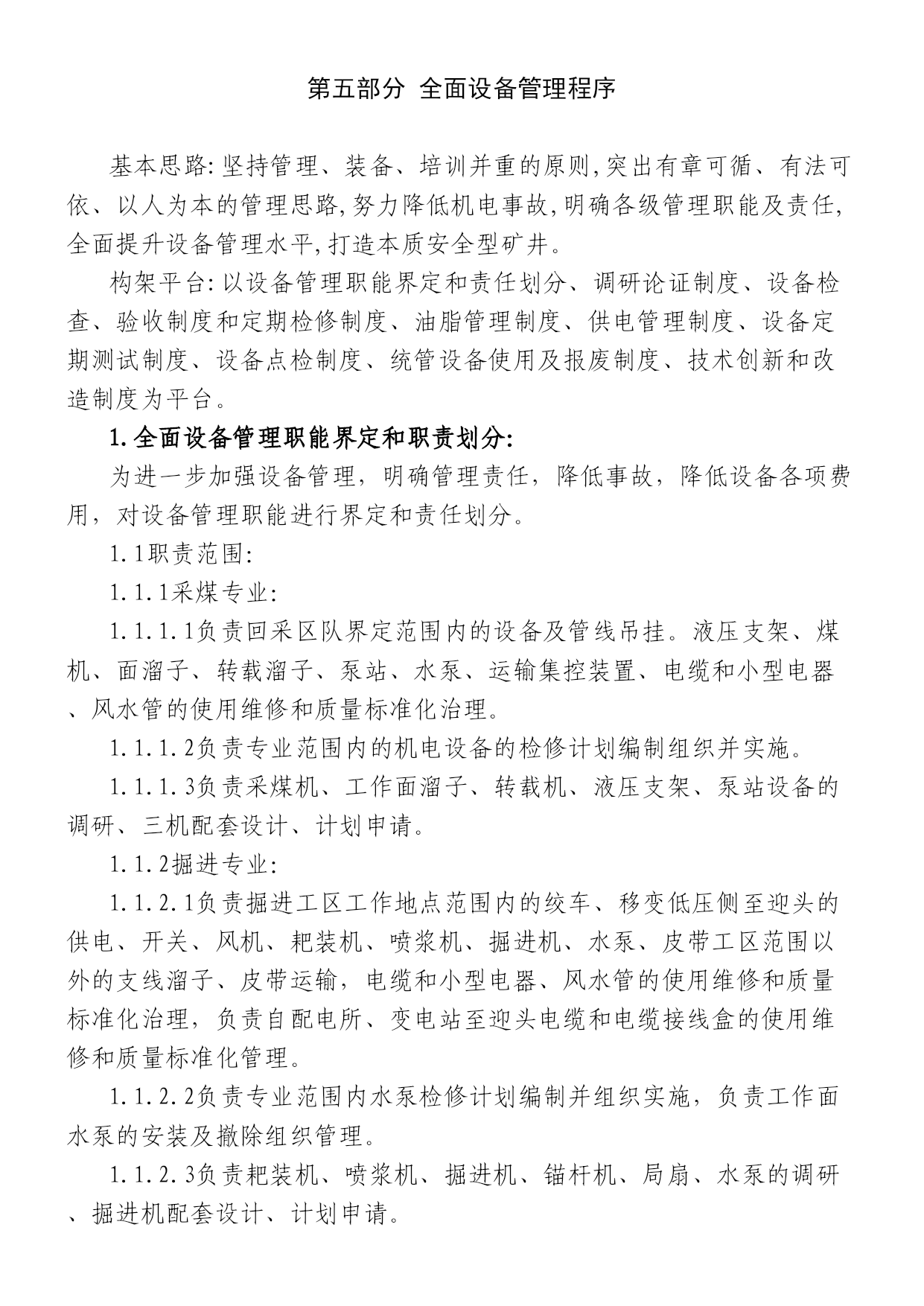 第五部分全面设备管理程序基本思路:坚持管理、装备、培训并重的原则,突出有章可循、有法可依、以人为本的管理思路,努力降低机电事故,明确各级管理职能及责任,全面提升设备管理水平,打造本质安全型矿井。构架平台:以设备管理职能界定和责任划分、调研论证制度、设备检查、验收制度和定期检修制度、油脂管理制度、供电管理制度、设备定期测试制度、设备点检制度、统管设备使用及报废制度、技术创新和改造制度为平台。1.全面设备管理职能界定和职责划分:为进一步加强设备管理,明确管理责任,降低事故,降低设备各项费用,对设备管理职能进行