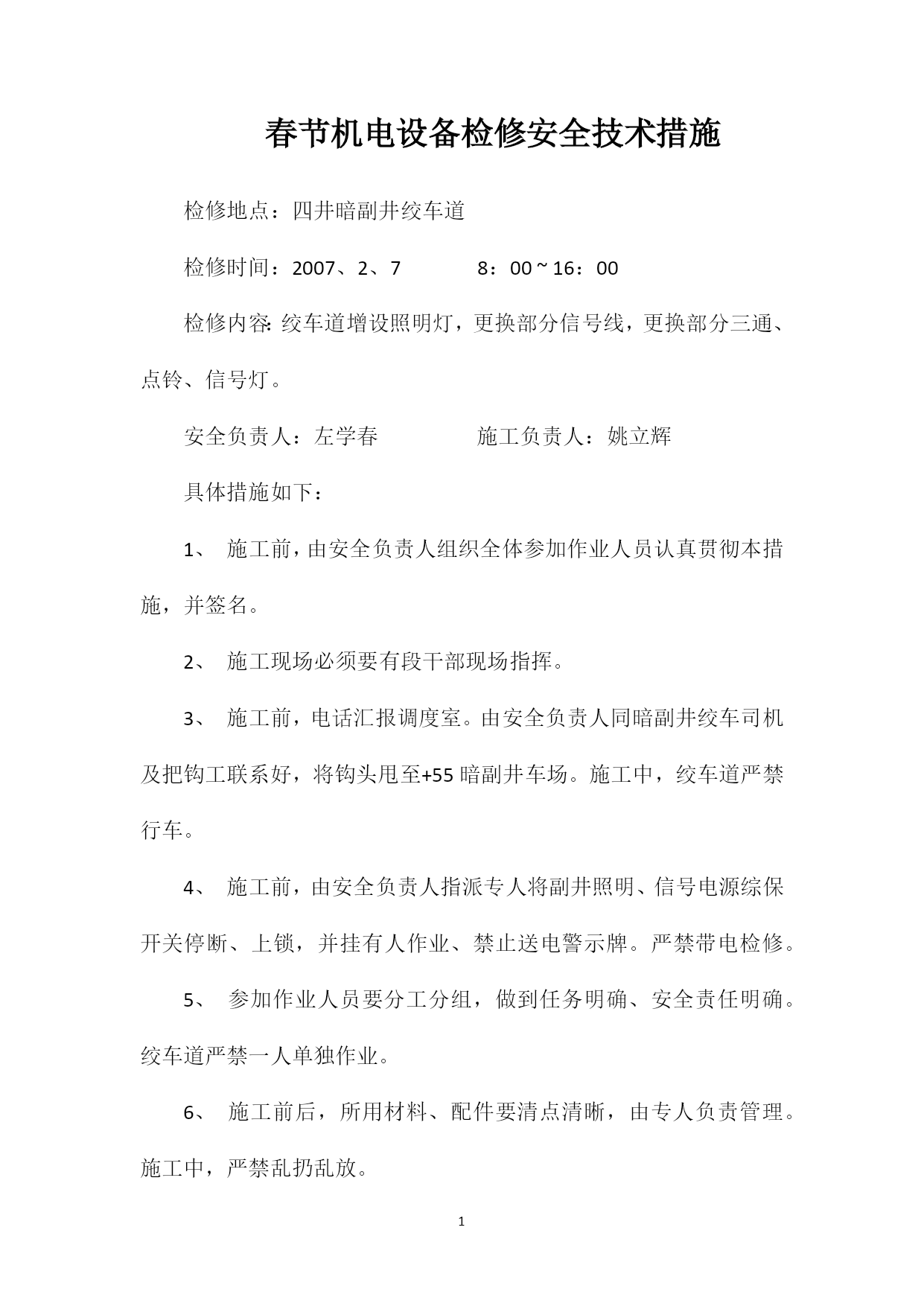 PAGEPAGE2春节机电设备检修安全技术措施检修地点:四井暗副井绞车道检修时间:2007、2、78:00~16:00检修内容:绞车道增设照明灯,更换部分信号线,更换部分三通、点铃、信号灯。安全负责人:左学春施工负责人:姚立辉具体措施如下:1、施工前,由安全负责人组织全体参加作业人员认真贯彻本措施,并签名。2、施工现场必须要有段干部现场指挥。3、施工前,电话汇报调度室。由安全负责人同暗副井绞车司机及把钩工联系好,将钩头甩至+55暗副井车场。施工中,绞车道严禁行车。4、施工前,由安全负责人指派专