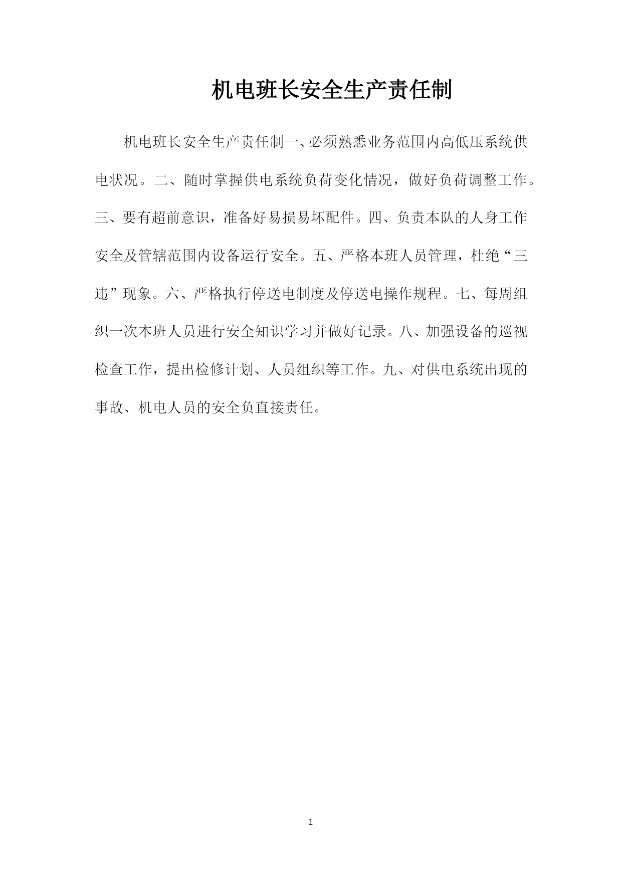 PAGEPAGE1机电班长安全生产责任制机电班长安全生产责任制一、必须熟悉业务范围内高低压系统供电状况。二、随时掌握供电系统负荷变化情况,做好负荷调整工作。三、要有超前意识,准备好易损易坏配件。四、负责本队的人身工作安全及管辖范围内设备运行安全。五、严格本班人员管理,杜绝“三违”现象。六、严格执行停送电制度及停送电操作规程。七、每周组织一次本班人员进行安全知识学习并做好记录。八、加强设备的巡视检查工作,提出检修计划、人员组织等工作。九、对供电系统出现的事故、机电人员的安全负直接责任。