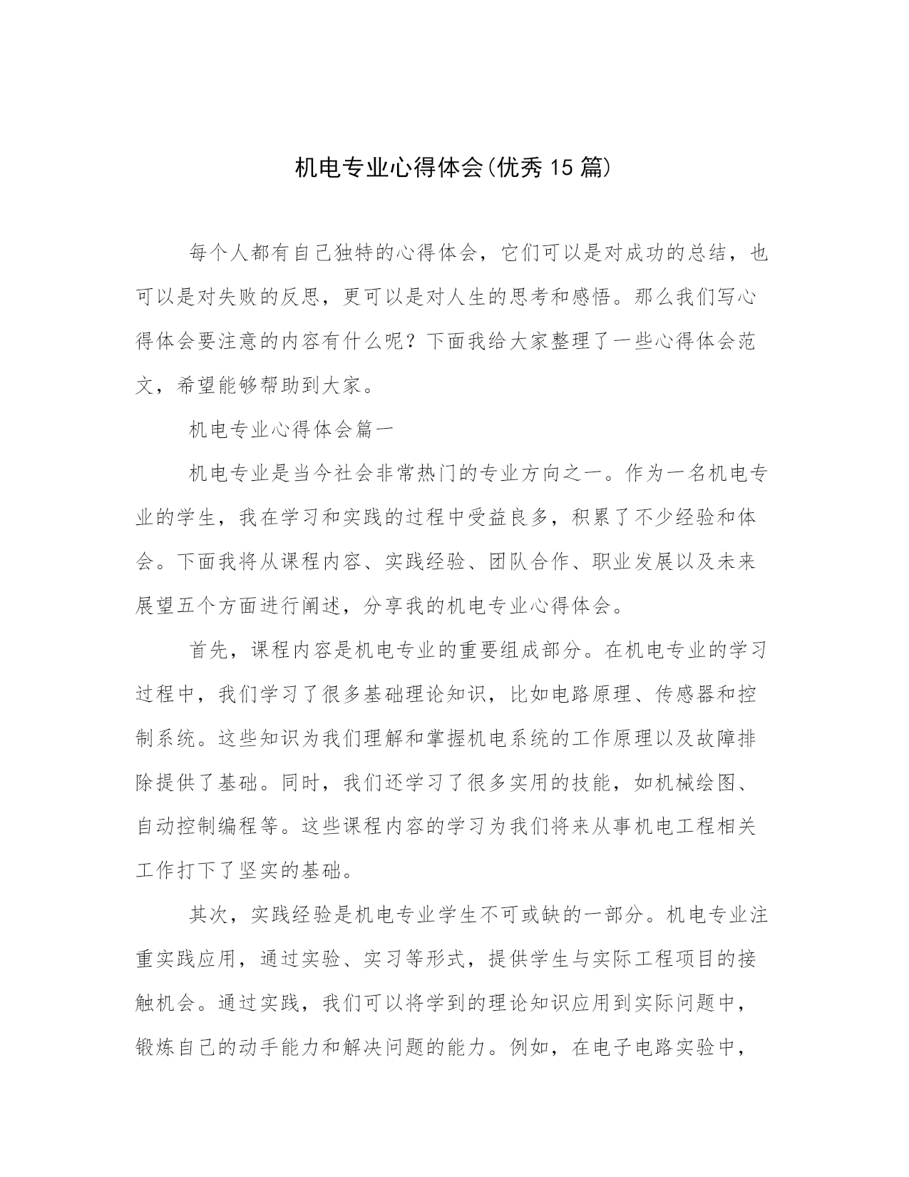 机电专业心得体会(优秀15篇)每个人都有自己独特的心得体会,它们可以是对成功的总结,也可以是对失败的反思,更可以是对人生的思考和感悟。那么我们写心得体会要注意的内容有什么呢?下面我给大家整理了一些心得体会范文,希望能够帮助到大家。机电专业心得体会篇一机电专业是当今社会非常热门的专业方向之一。作为一名机电专业的学生,我在学习和实践的过程中受益良多,积累了不少经验和体会。下面我将从课程内容、实践经验、团队合作、职业发展以及未来展望五个方面进行阐述,分享我的机电专业心得体会。首先,课程内容是机电专业的重要组成部