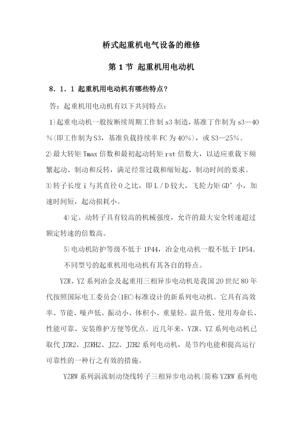 桥式起重机电气设备的维修第1节起重机用电动机8.1.1起重机用电动机有哪些特点?答:起重机用电动机有以下共同特点:1)起重电动机一般按断续周期工作制s3制造,基准丁作制为s3—40%(即工作制为S3,基准负载持续率FC为40%),或S3—25%。2)最大转矩Tmax倍数和最初起动转矩rst倍数大,以适应重载下频繁起动、制动和反转,满足经常过载和缩短起、制动时间的要求。3)转子长度i与其直径0之比,即L/D较大,飞轮力矩GD’小,加速时间短,起动损耗小。4)定、动转子具有较高的机械强度,允许的最大安全转速超