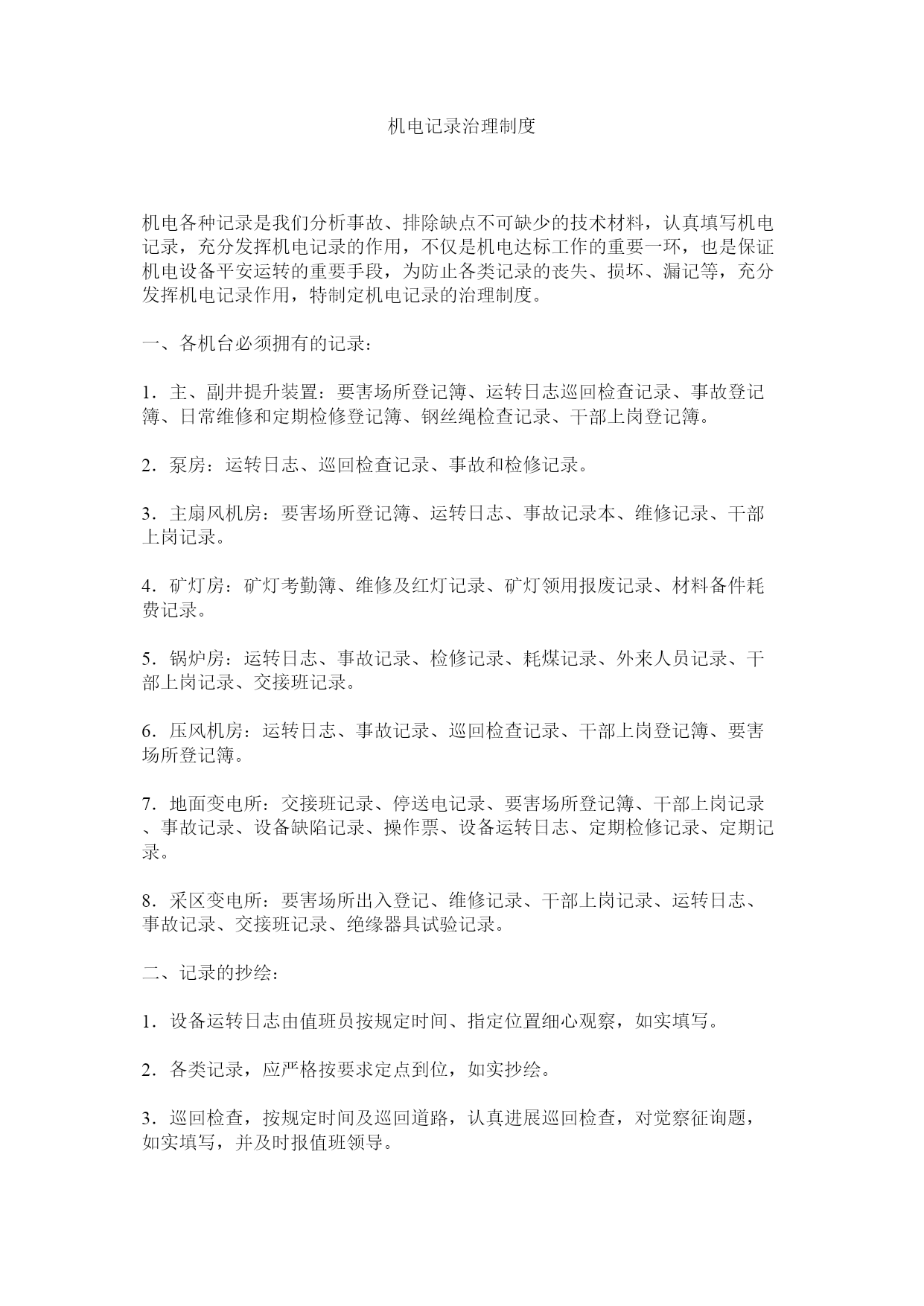 机电记录治理制度机电各种记录是我们分析事故、排除缺点不可缺少的技术材料,认真填写机电记录,充分发挥机电记录的作用,不仅是机电达标工作的重要一环,也是保证机电设备平安运转的重要手段,为防止各类记录的丧失、损坏、漏记等,充分发挥机电记录作用,特制定机电记录的治理制度。一、各机台必须拥有的记录:1.主、副井提升装置:要害场所登记簿、运转日志巡回检查记录、事故登记簿、日常维修和定期检修登记簿、钢丝绳检查记录、干部上岗登记簿。2.泵房:运转日志、巡回检查记录、事故和检修记录。3.主扇风机房:要害场所登记簿、运转日志