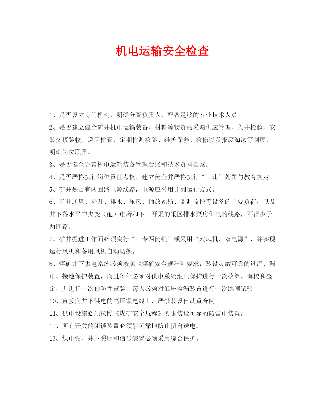 此资料由网络收集而来,如有侵权请告知上传者立即删除。资料共分享,我们负责传递知识。机电运输安全检查1、是否设立专门机构,明确分管负责人,配备足够的专业技术人员。2、是否建立健全矿井机电运输装备、材料等物资的采购供应管理、入井检验、安装交接验收、巡回检查、定期检测检验、维护保养、检修以及报废淘汰等制度,明确岗位职责。3、是否健全完善机电运输装备管理台账和技术资料档案。4、是否严格执行岗位责任考核,建立健全并严格执行“三违”处罚与教育规定。5、矿井是否有两回路电源线路,电源应采用并列运行方式。6、矿井通风、提