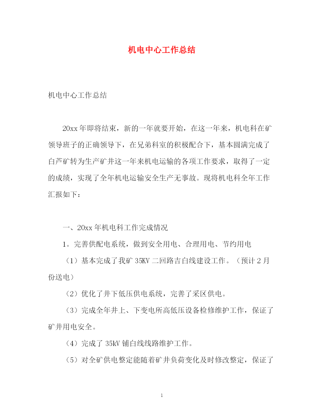 此资料由网络收集而来,如有侵权请告知上传者立即删除。资料共分享,我们负责传递知识。PAGEPAGE6机电中心工作总结机电中心工作总结20xx年即将结束,新的一年就要开始,在这一年来,机电科在矿领导班子的正确领导下,在兄弟科室的积极配合下,基本圆满完成了白芦矿转为生产矿井这一年来机电运输的各项工作要求,取得了一定的成绩,实现了全年机电运输安全生产无事故。现将机电科全年工作汇报如下:一、20xx年机电科工作完成情况1。完善供配电系统,做到安全用电、合理用电、节约用电(1)基本完成了我矿35KV二回