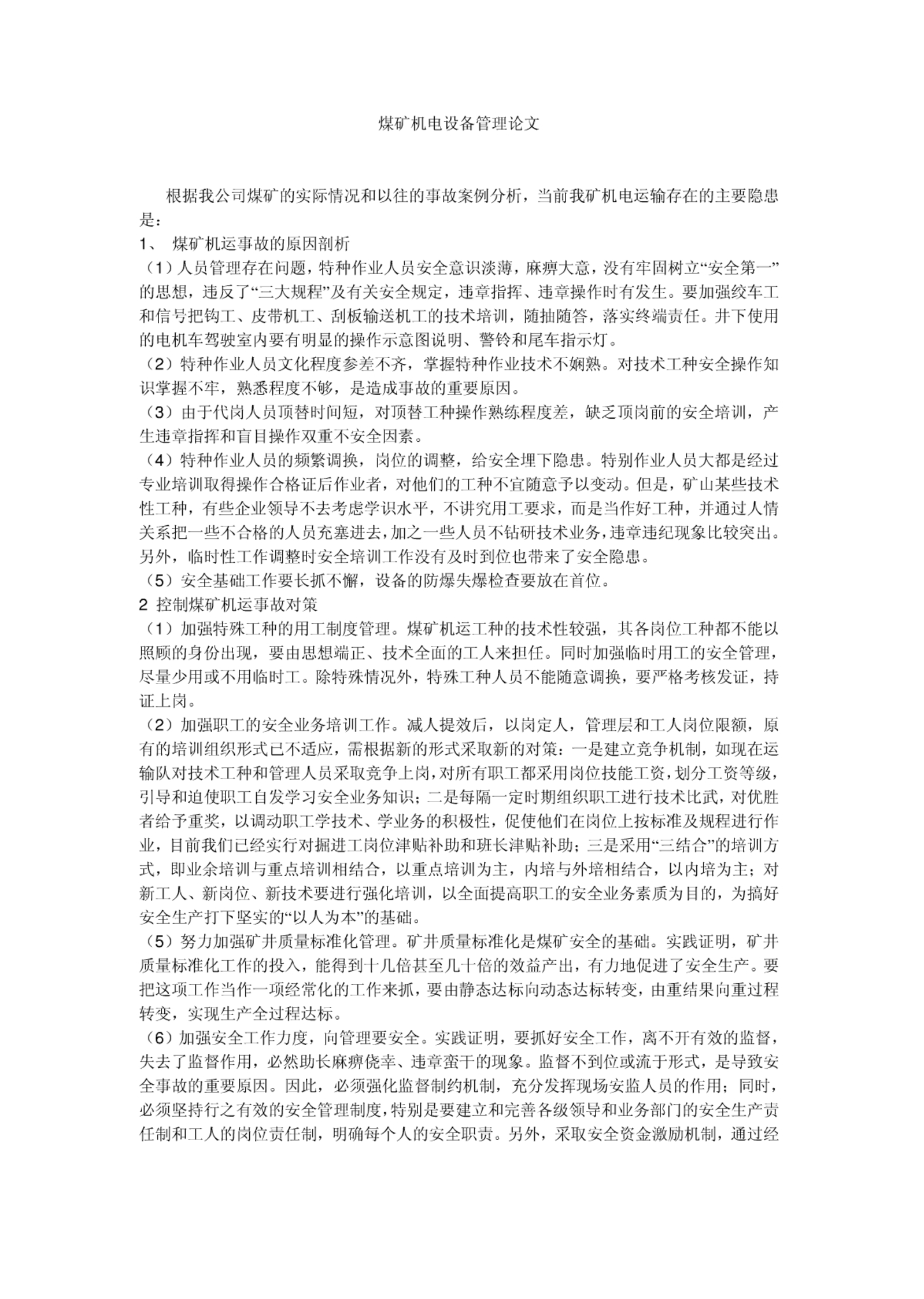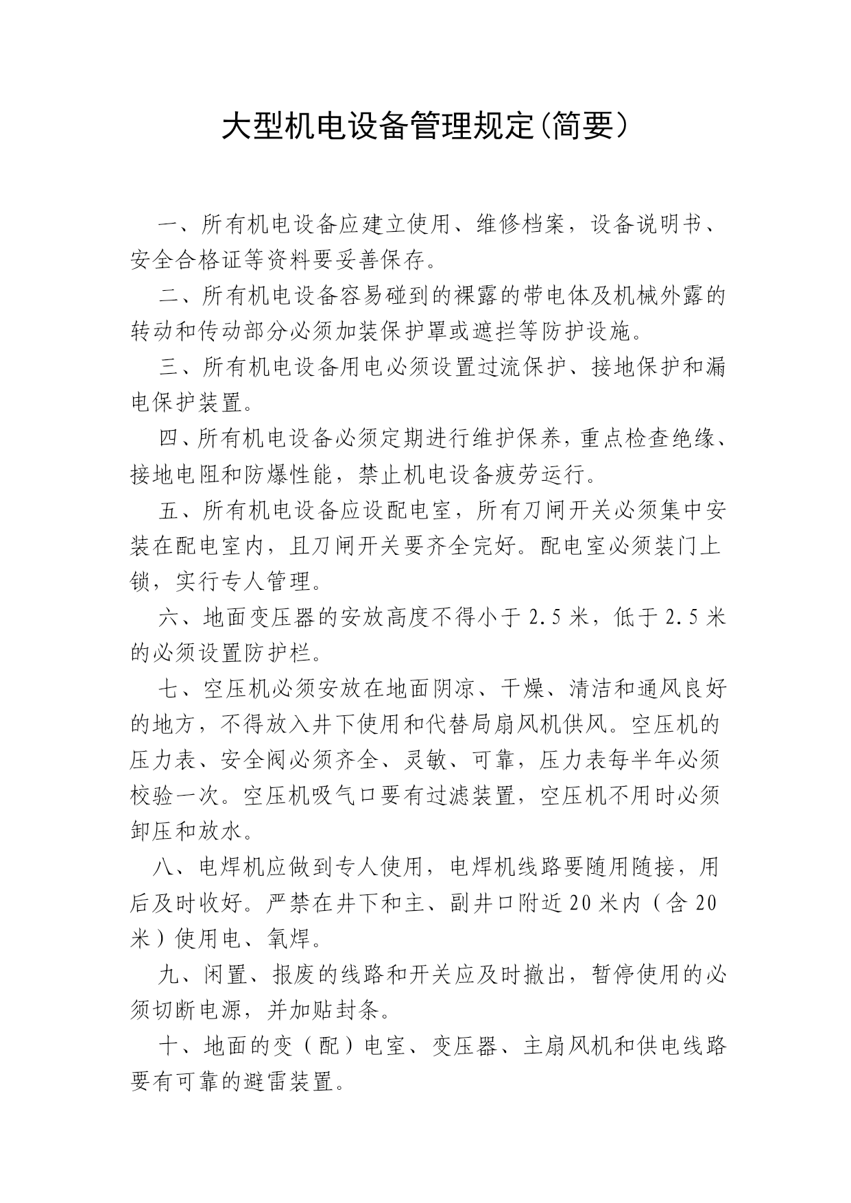 大型机电设备管理规定(简要)一、所有机电设备应建立使用、维修档案,设备说明书、安全合格证等资料要妥善保存。二、所有机电设备容易碰到的裸露的带电体及机械外露的转动和传动部分必须加装保护罩或遮拦等防护设施。三、所有机电设备用电必须设置过流保护、接地保护和漏电保护装置。四、所有机电设备必须定期进行维护保养,重点检查绝缘、接地电阻和防爆性能,禁止机电设备疲劳运行。五、所有机电设备应设配电室,所有刀闸开关必须集中安装在配电室内,且刀闸开关要齐全完好。配电室必须装门上锁,实行专人管理。六、地面变压器的安放高度不得小于