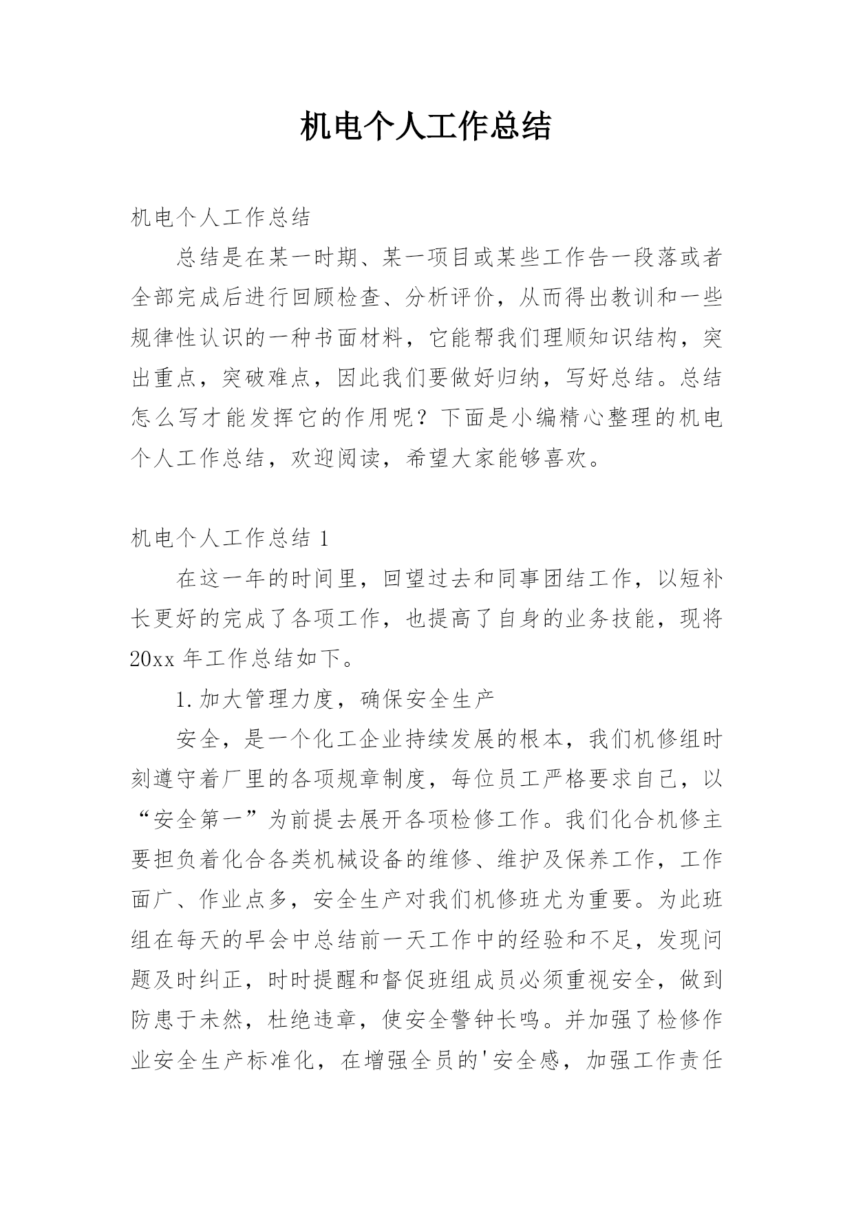 机电个人工作总结机电个人工作总结总结是在某一时期、某一项目或某些工作告一段落或者全部完成后进行回顾检查、分析评价,从而得出教训和一些规律性认识的一种书面材料,它能帮我们理顺知识结构,突出重点,突破难点,因此我们要做好归纳,写好总结。总结怎么写才能发挥它的作用呢?下面是小编精心整理的机电个人工作总结,欢迎阅读,希望大家能够喜欢。机电个人工作总结1在这一年的时间里,回望过去和同事团结工作,以短补长更好的完成了各项工作,也提高了自身的业务技能,现将20xx年工作总结如下。1.加大管理力度,确保安全生产安全,是一