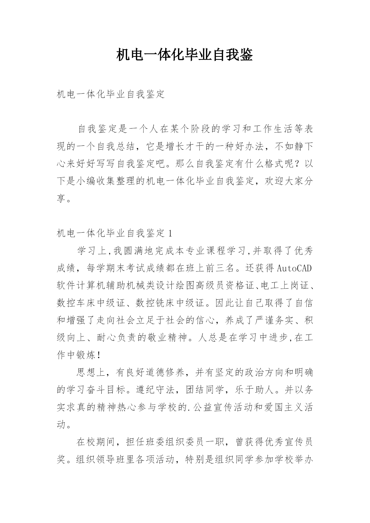 机电一体化毕业自我鉴机电一体化毕业自我鉴定自我鉴定是一个人在某个阶段的学习和工作生活等表现的一个自我总结,它是增长才干的一种好办法,不如静下心来好好写写自我鉴定吧。那么自我鉴定有什么格式呢?以下是小编收集整理的机电一体化毕业自我鉴定,欢迎大家分享。机电一体化毕业自我鉴定1学习上,我圆满地完成本专业课程学习,并取得了优秀成绩,每学期末考试成绩都在班上前三名。还获得AutoCAD软件计算机辅助机械类设计绘图高级员资格证、电工上岗证、数控车床中级证、数控铣床中级证。因此让自己取得了自信和增强了走向社会立足于社会