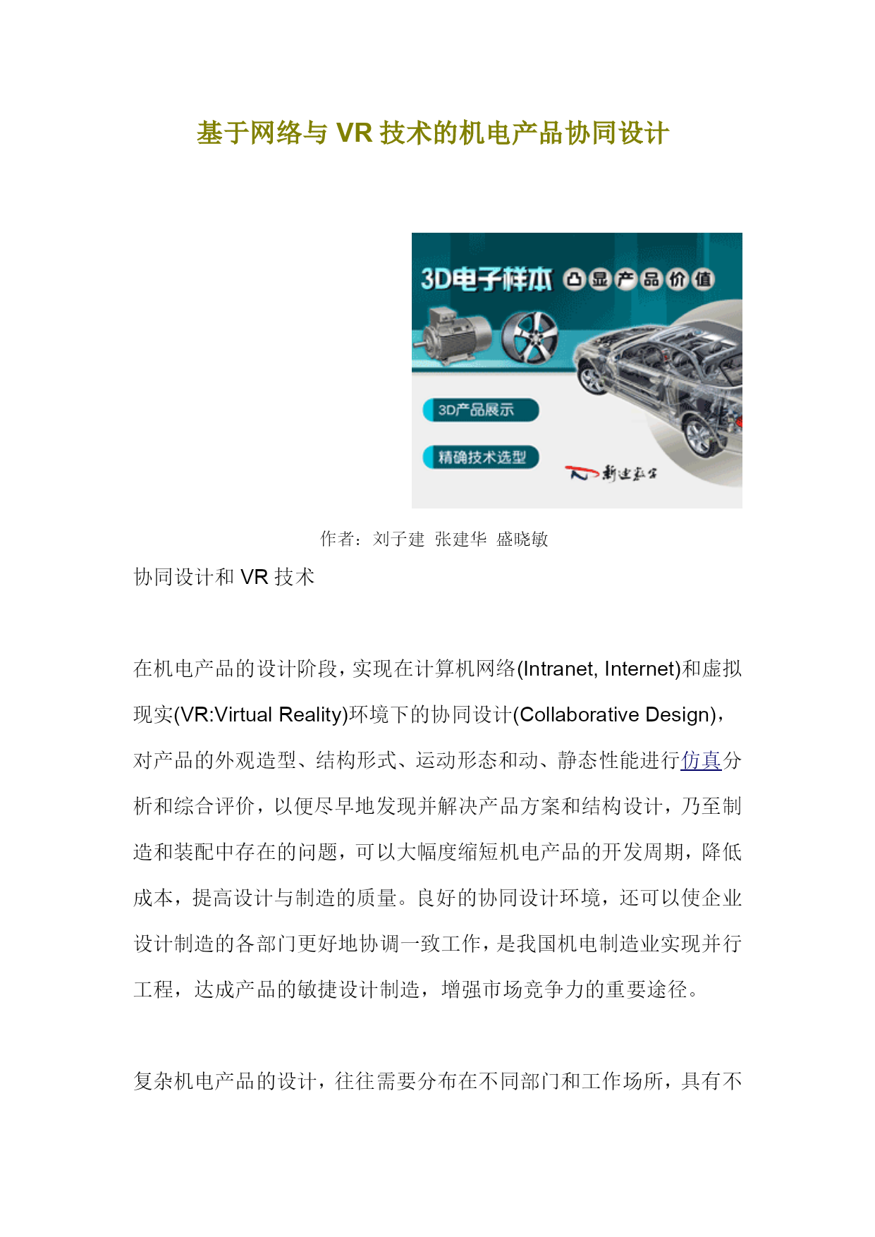 基于网络与VR技术的机电产品协同设计作者:刘子建张建华盛晓敏协同设计和VR技术在机电产品的设计阶段,实现在计算机网络(Intranet,Internet)和虚拟现实(VR:VirtualReality)环境下的协同设计(CollaborativeDesign),对产品的外观造型、结构形式、运动形态和动、静态性能进行HYPERLINK"http://www.newmaker.com/cat_1310002.html"\t"_blank"仿真分析和综合评价,以便尽早地发现并解决产品方案和结构设计,乃至制