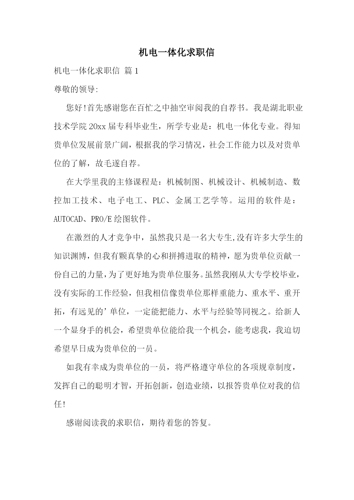 机电一体化求职信机电一体化求职信篇1尊敬的领导:您好!首先感谢您在百忙之中抽空审阅我的自荐书。我是湖北职业技术学院20xx届专科毕业生,所学专业是:机电一体化专业。得知贵单位发展前景广阔,根据我的学习情况,社会工作能力以及对贵单位的了解,故毛遂自荐。在大学里我的主修课程是:机械制图、机械设计、机械制造、数控加工技术、电子电工、PLC、金属工艺学等。运用的软件是:AUTOCAD、PRO/E绘图软件。在激烈的人才竞争中,虽然我只是一名大专生,没有许多大学生的知识渊博,但我有颗真挚的心和拼搏进取的精神,愿为贵单