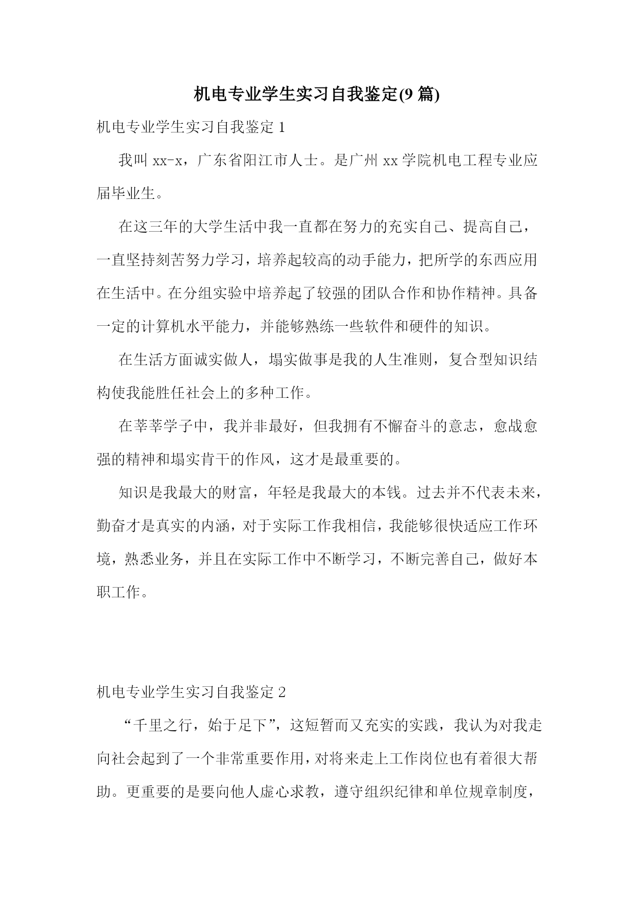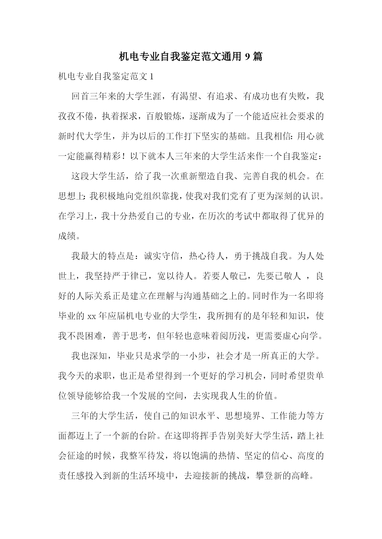 机电专业自我鉴定范文通用9篇机电专业自我鉴定范文1回首三年来的大学生涯,有渴望、有追求、有成功也有失败,我孜孜不倦,执着探求,百般锻炼,逐渐成为了一个能适应社会要求的新时代大学生,并为以后的工作打下坚实的基础。且我相信:用心就一定能赢得精彩!以下就本人三年来的大学生活来作一个自我鉴定:这段大学生活,给了我一次重新塑造自我、完善自我的机会。在思想上:我积极地向党组织靠拢,使我对我们党有了更为深刻的认识。在学习上,我十分热爱自己的专业,在历次的考试中都取得了优异的成绩。我最大的特点是:诚实守信,热心待人,勇于