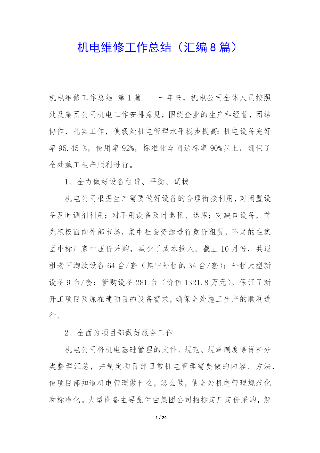 PAGE24/NUMPAGES24机电维修工作总结(汇编8篇)机电维修工作总结第1篇一年来,机电公司全体人员按照处及集团公司机电工作安排意见,围绕企业的生产和经营,团结协作,扎实工作,使我处机电管理水平稳步提高:机电设备完好率95.45%,使用率92%,标准化车间达标率90%以上,确保了全处施工生产顺利进行。1、全力做好设备租赁、平衡、调拨机电公司根据生产需要做好设备的合理衔接利用,对闲置设备及时调剂利用;对不用设备及时退租、退库;对缺口设备,首先积极面向外部市场,集中社会资源进行竟价租赁,不