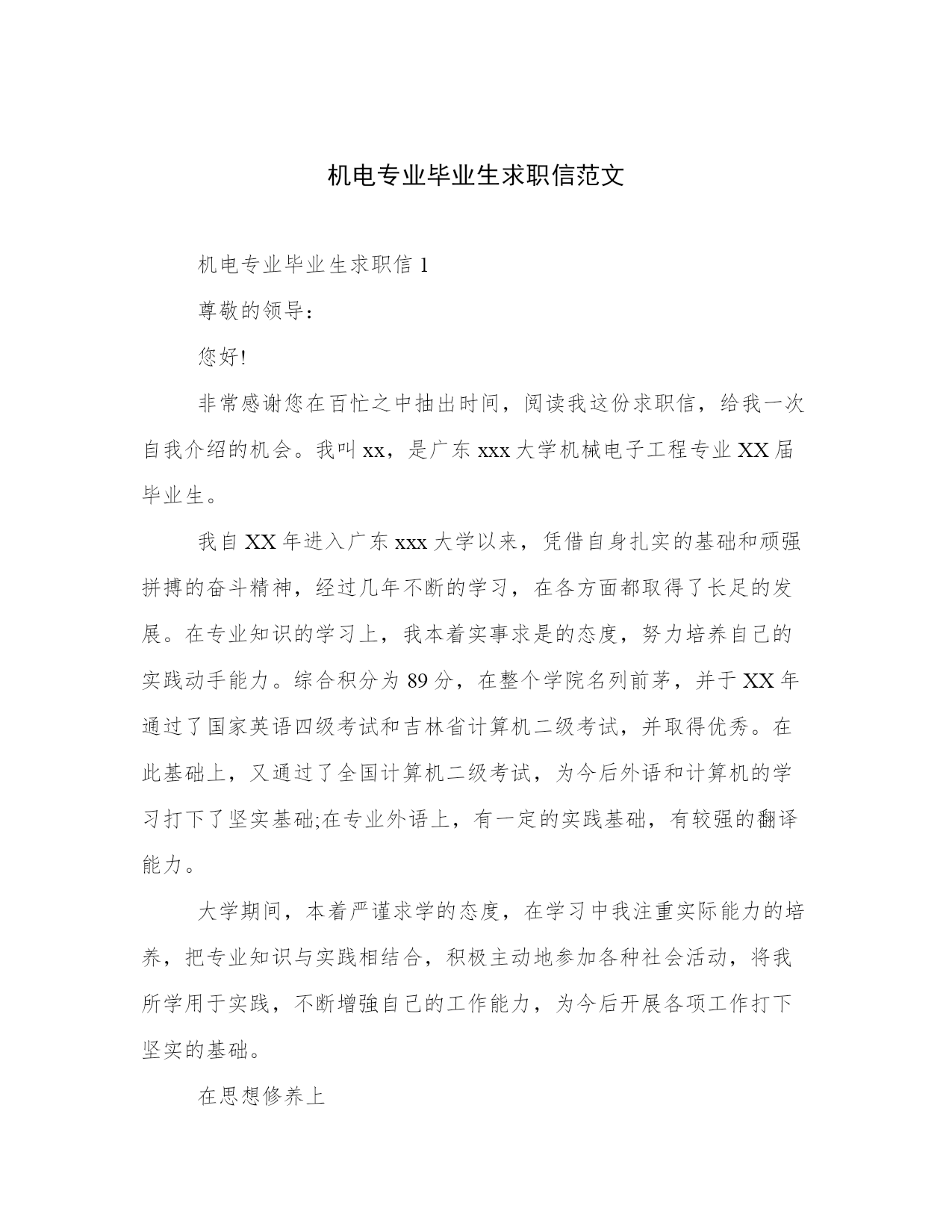 机电专业毕业生求职信范文机电专业毕业生求职信1尊敬的领导:您好!非常感谢您在百忙之中抽出时间,阅读我这份求职信,给我一次自我介绍的机会。我叫xx,是广东xxx大学机械电子工程专业XX届毕业生。我自XX年进入广东xxx大学以来,凭借自身扎实的基础和顽强拼搏的奋斗精神,经过几年不断的学习,在各方面都取得了长足的发展。在专业知识的学习上,我本着实事求是的态度,努力培养自己的实践动手能力。综合积分为89分,在整个学院名列前茅,并于XX年通过了国家英语四级考试和吉林省计算机二级考试,并取得优秀。在此基础上,又通过了