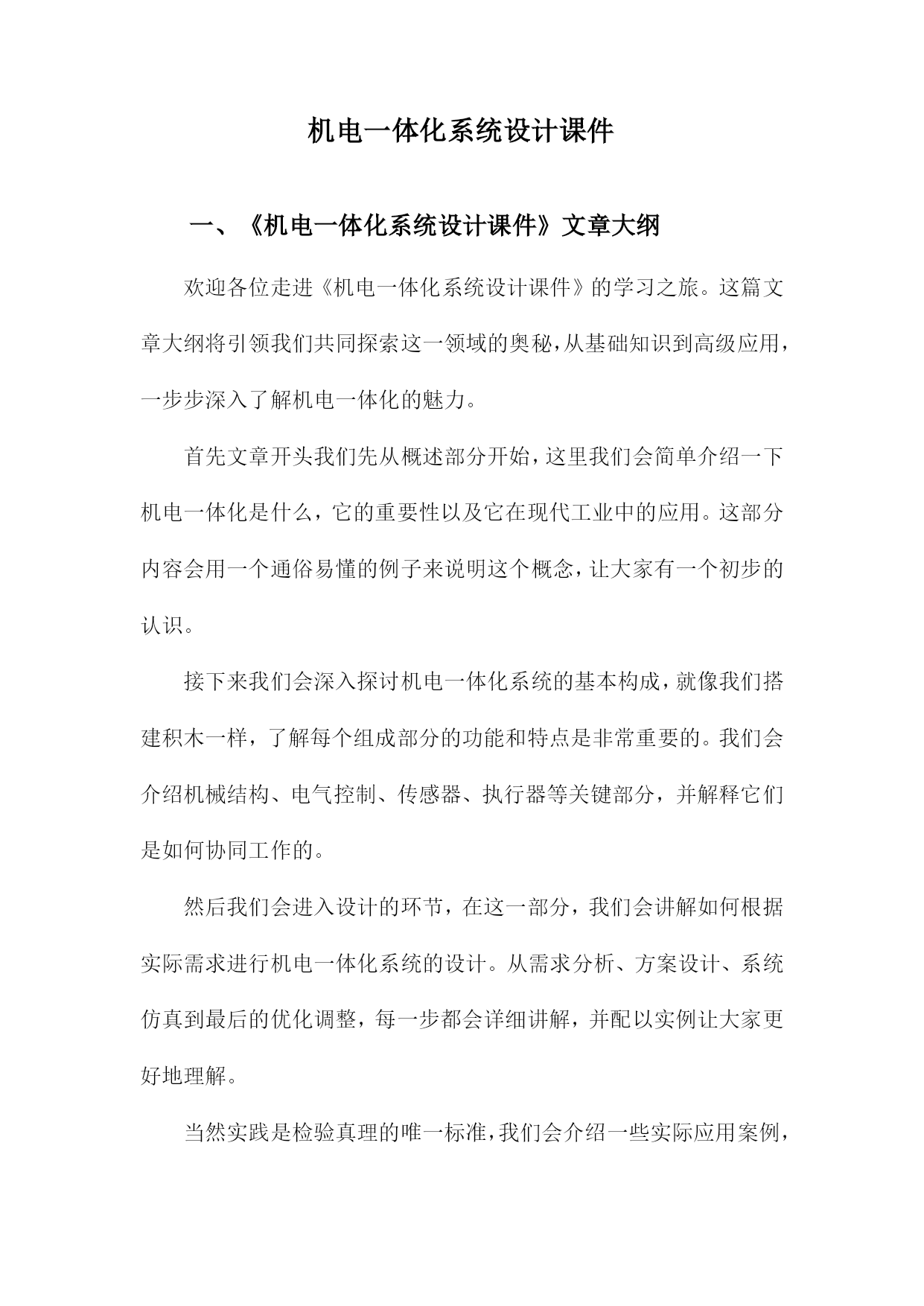 机电一体化系统设计课件一、《机电一体化系统设计课件》文章大纲欢迎各位走进《机电一体化系统设计课件》的学习之旅。这篇文章大纲将引领我们共同探索这一领域的奥秘,从基础知识到高级应用,一步步深入了解机电一体化的魅力。首先文章开头我们先从概述部分开始,这里我们会简单介绍一下机电一体化是什么,它的重要性以及它在现代工业中的应用。这部分内容会用一个通俗易懂的例子来说明这个概念,让大家有一个初步的认识。接下来我们会深入探讨机电一体化系统的基本构成,就像我们搭建积木一样,了解每个组成部分的功能和特点是非常重要的。我们会介