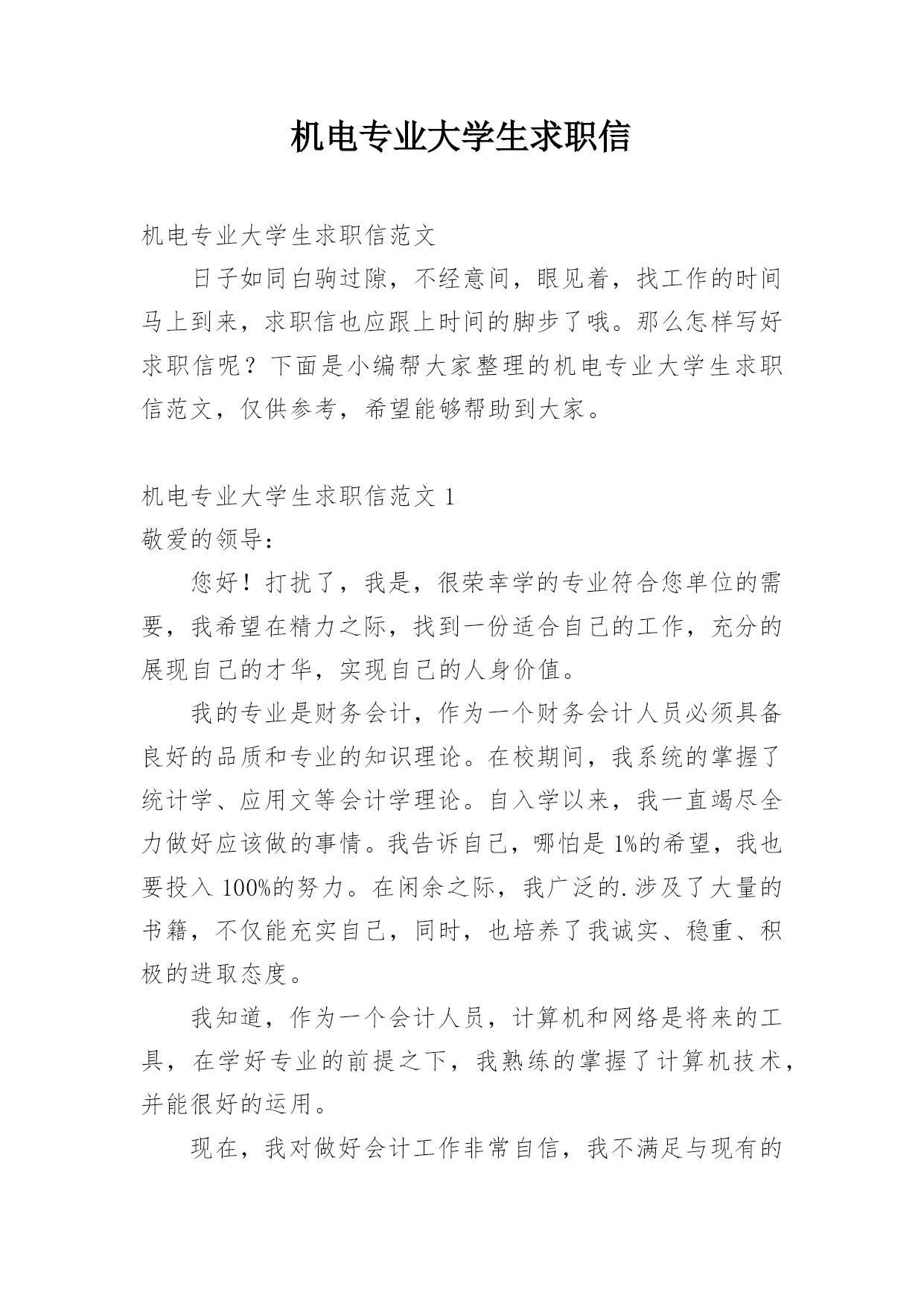 机电专业大学生求职信机电专业大学生求职信范文日子如同白驹过隙,不经意间,眼见着,找工作的时间马上到来,求职信也应跟上时间的脚步了哦。那么怎样写好求职信呢?下面是小编帮大家整理的机电专业大学生求职信范文,仅供参考,希望能够帮助到大家。机电专业大学生求职信范文1敬爱的领导:您好!打扰了,我是,很荣幸学的专业符合您单位的需要,我希望在精力之际,找到一份适合自己的工作,充分的展现自己的才华,实现自己的人身价值。我的专业是财务会计,作为一个财务会计人员必须具备良好的品质和专业的知识理论。在校期间,我系统的掌握了统计