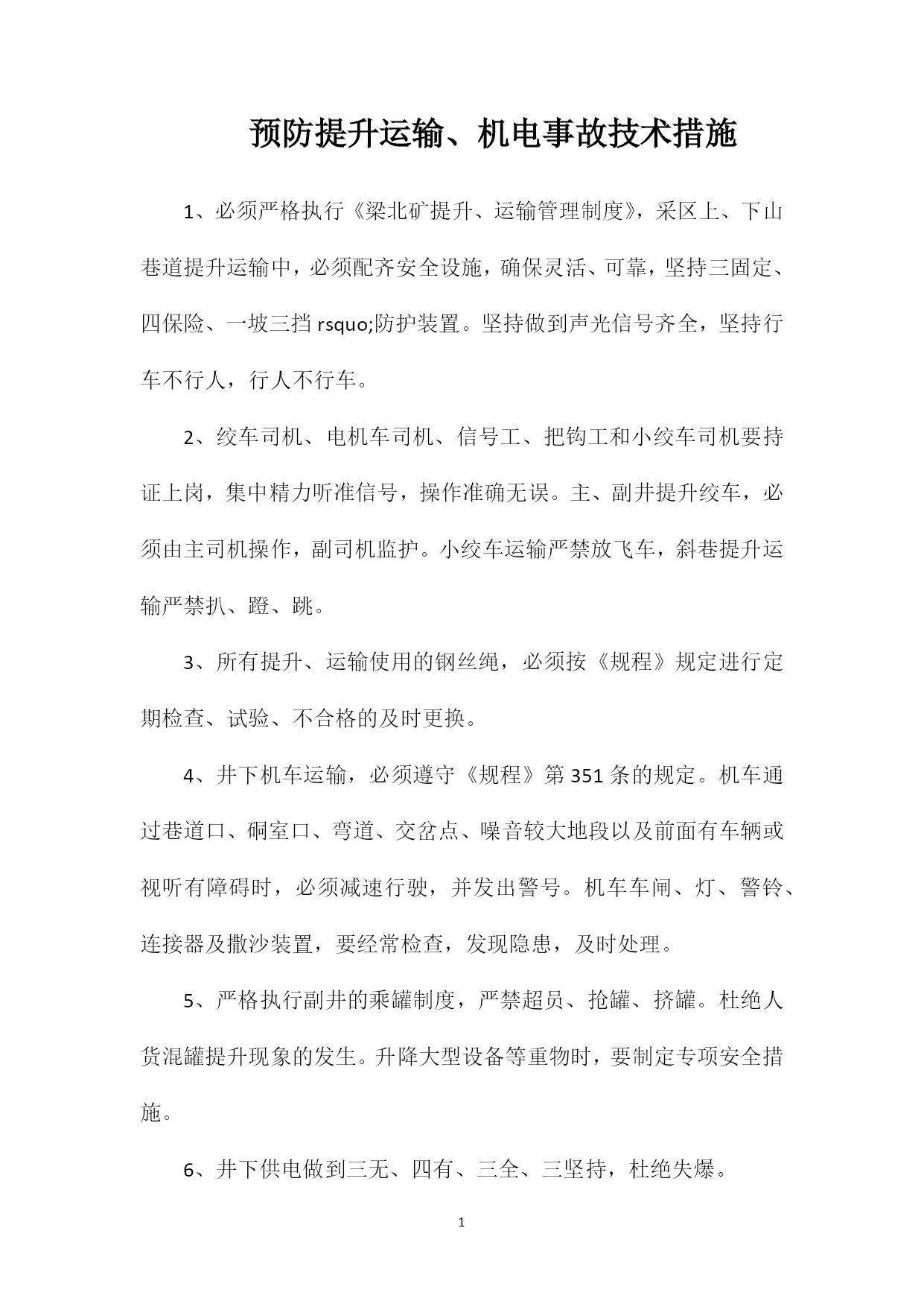PAGEPAGE2预防提升运输、机电事故技术措施1、必须严格执行《梁北矿提升、运输管理制度》,采区上、下山巷道提升运输中,必须配齐安全设施,确保灵活、可靠,坚持三固定、四保险、一坡三挡rsquo;防护装置。坚持做到声光信号齐全,坚持行车不行人,行人不行车。2、绞车司机、电机车司机、信号工、把钩工和小绞车司机要持证上岗,集中精力听准信号,操作准确无误。主、副井提升绞车,必须由主司机操作,副司机监护。小绞车运输严禁放飞车,斜巷提升运输严禁扒、蹬、跳。3、所有提升、运输使用的钢丝绳,必须按《规程》规