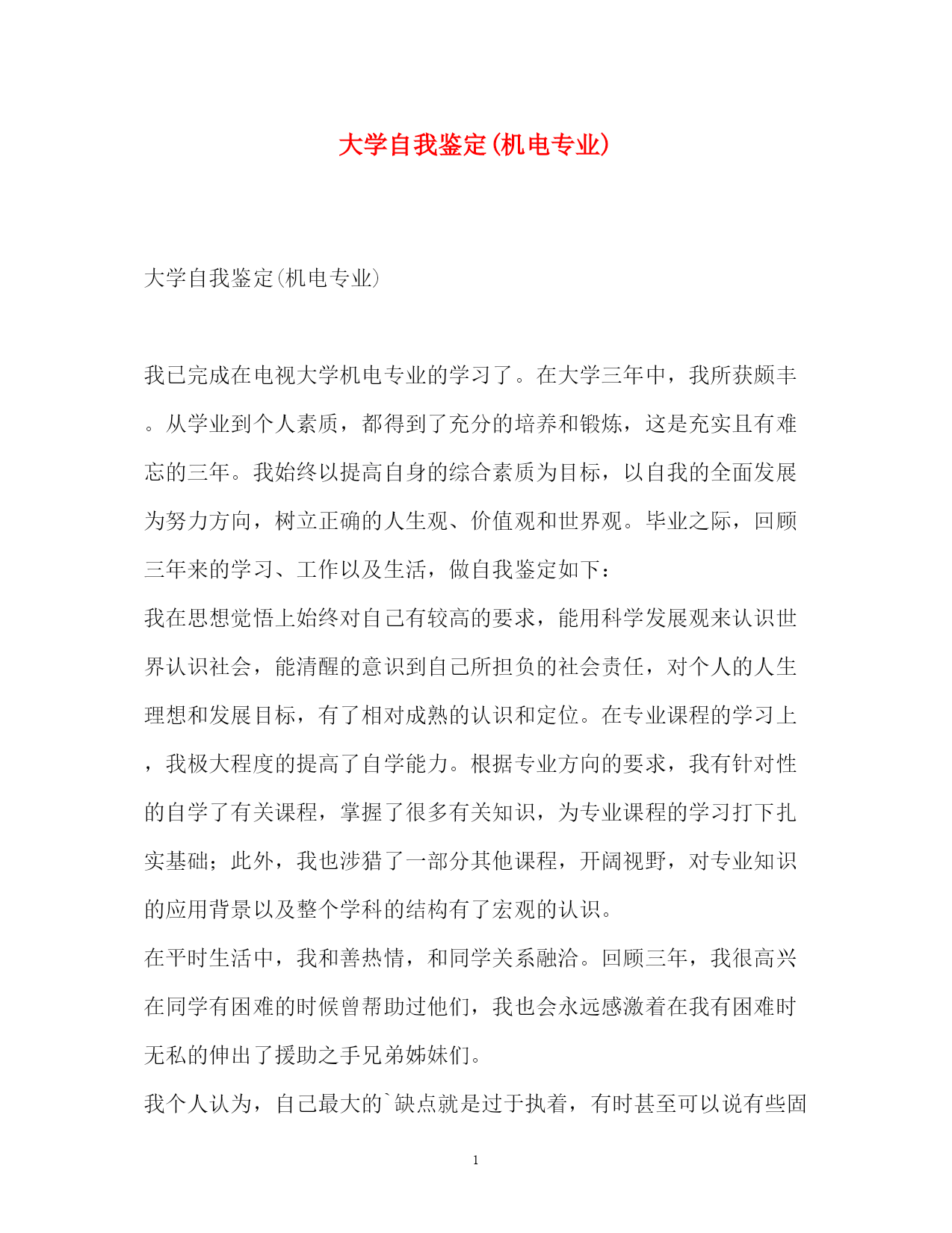 此资料由网络收集而来,如有侵权请告知上传者立即删除。资料共分享,我们负责传递知识。PAGEPAGE2大学自我鉴定(机电专业)大学自我鉴定(机电专业)我已完成在电视大学机电专业的学习了。在大学三年中,我所获颇丰。从学业到个人素质,都得到了充分的培养和锻炼,这是充实且有难忘的三年。我始终以提高自身的综合素质为目标,以自我的全面发展为努力方向,树立正确的人生观、价值观和世界观。毕业之际,回顾三年来的学习、工作以及生活,做自我鉴定如下:我在思想觉悟上始终对自己有较高的要求,能用科学发展观来认识世界认识