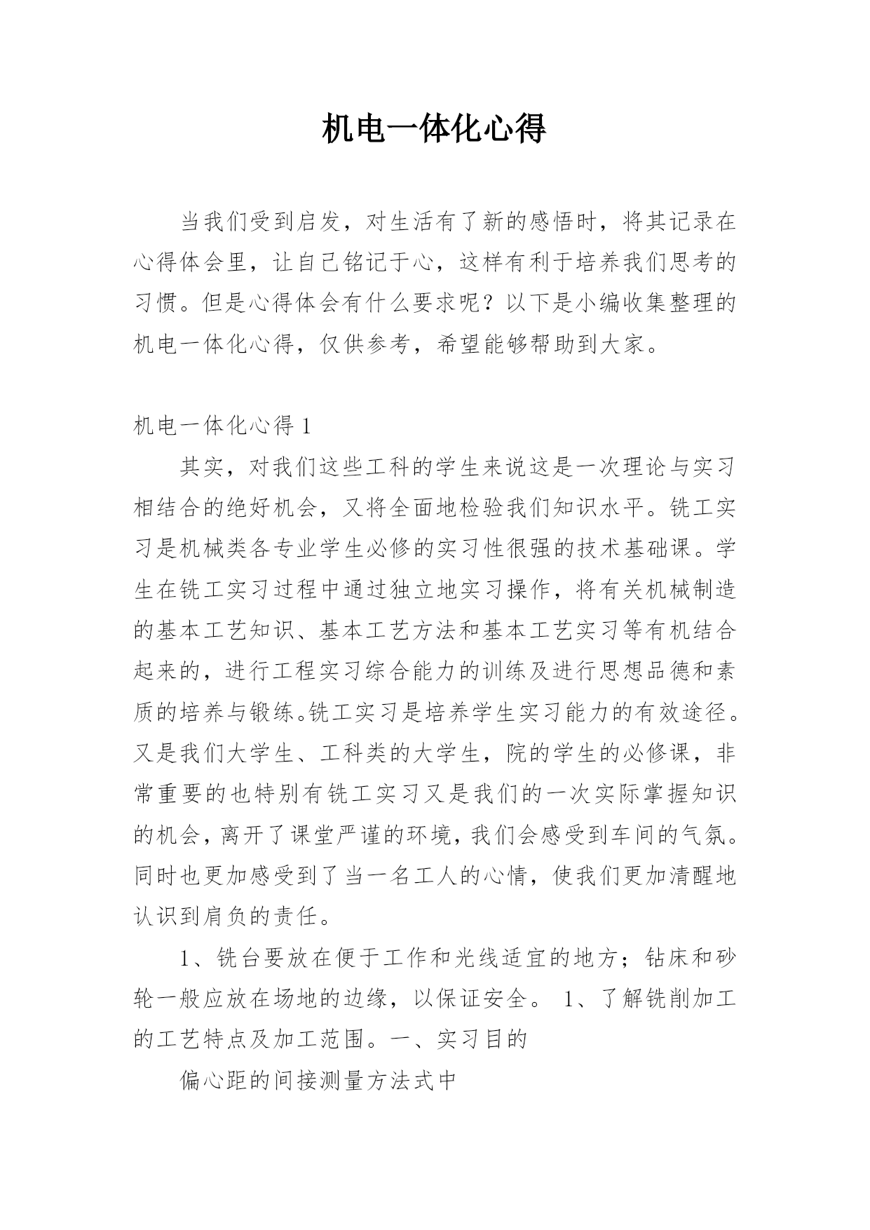 机电一体化心得当我们受到启发,对生活有了新的感悟时,将其记录在心得体会里,让自己铭记于心,这样有利于培养我们思考的习惯。但是心得体会有什么要求呢?以下是小编收集整理的机电一体化心得,仅供参考,希望能够帮助到大家。机电一体化心得1其实,对我们这些工科的学生来说这是一次理论与实习相结合的绝好机会,又将全面地检验我们知识水平。铣工实习是机械类各专业学生必修的实习性很强的技术基础课。学生在铣工实习过程中通过独立地实习操作,将有关机械制造的基本工艺知识、基本工艺方法和基本工艺实习等有机结合起来的,进行工程实习综合能