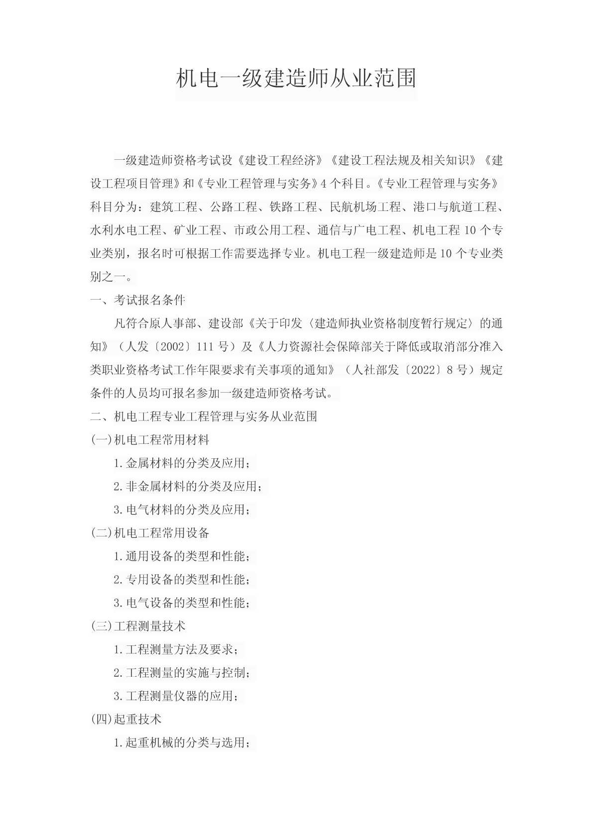 机电一级建造师从业范围一级建造师资格考试设《建设工程经济》《建设工程法规及相关知识》《建设工程项目管理》和《专业工程管理与实务》4个科目。《专业工程管理与实务》科目分为:建筑工程、公路工程、铁路工程、民航机场工程、港口与航道工程、水利水电工程、矿业工程、市政公用工程、通信与广电工程、机电工程10个专业类别,报名时可根据工作需要选择专业。机电工程一级建造师是10个专业类别之一。一、考试报名条件凡符合原人事部、建设部《关于印发〈建造师执业资格制度暂行规定〉的通知》(人发〔2002〕111号)及《人力资源社会保