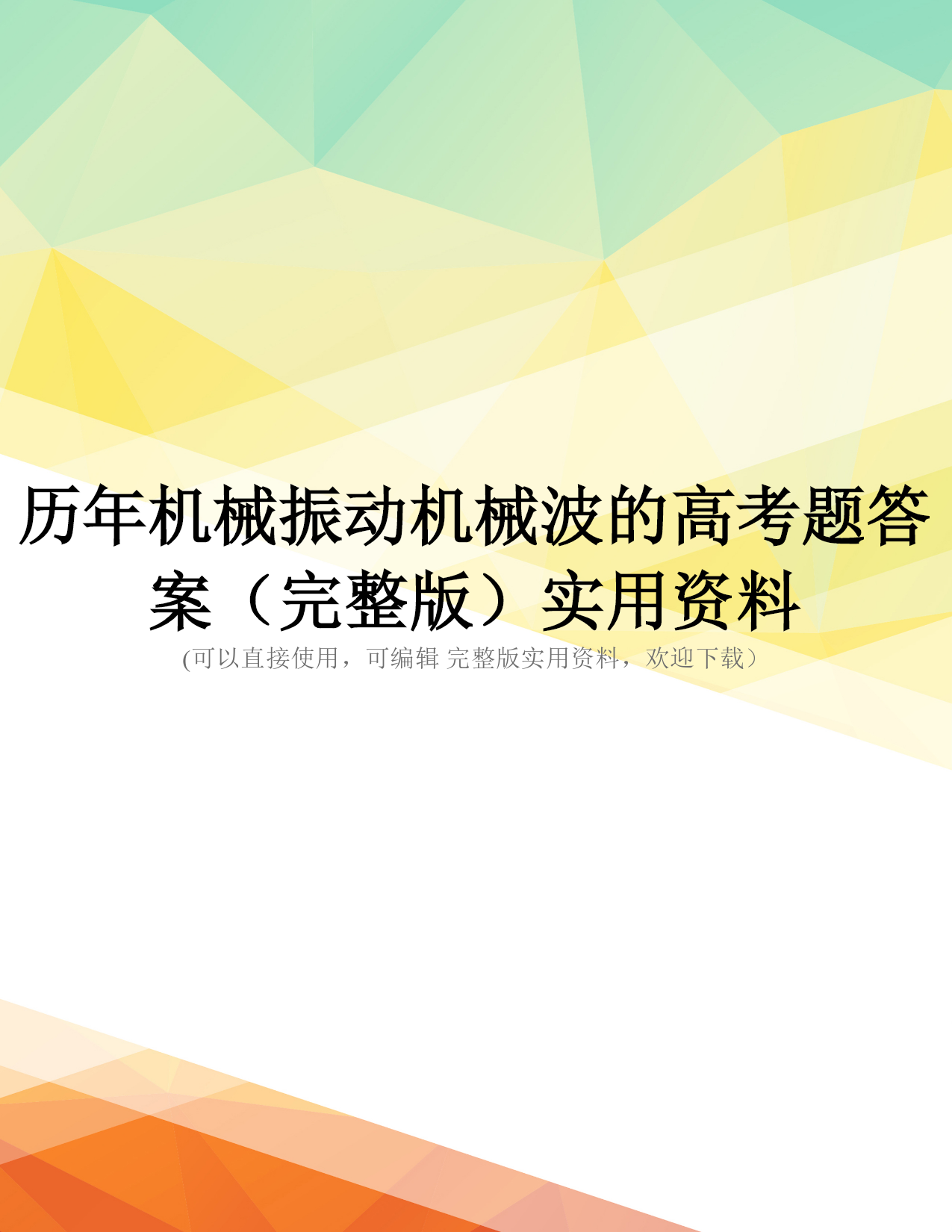 历年机械振动机械波的高考题答案(完整版)实用资料(可以直接使用,可编辑完整版实用资料,欢迎下载)全国一列横波在t=0时刻的波形如图中实线所示,由此可以判定此波的,振幅为质点的位移为yy=y=D.若<.若<.若>.若>全国简谐机械波在给定的媒质中传播时,下列说法中正确的是(D(03全国一束单色光从空气射入玻璃中,则其(CA.频率不变,波长变长C.频率变大,波长不变C.频率不变,波长变短D.频率变小,波长不变(03广东一弹簧振子沿x轴振动,振幅为4cm,振子的平衡位置位于x轴上的0点,图1中的a、b、c、d为