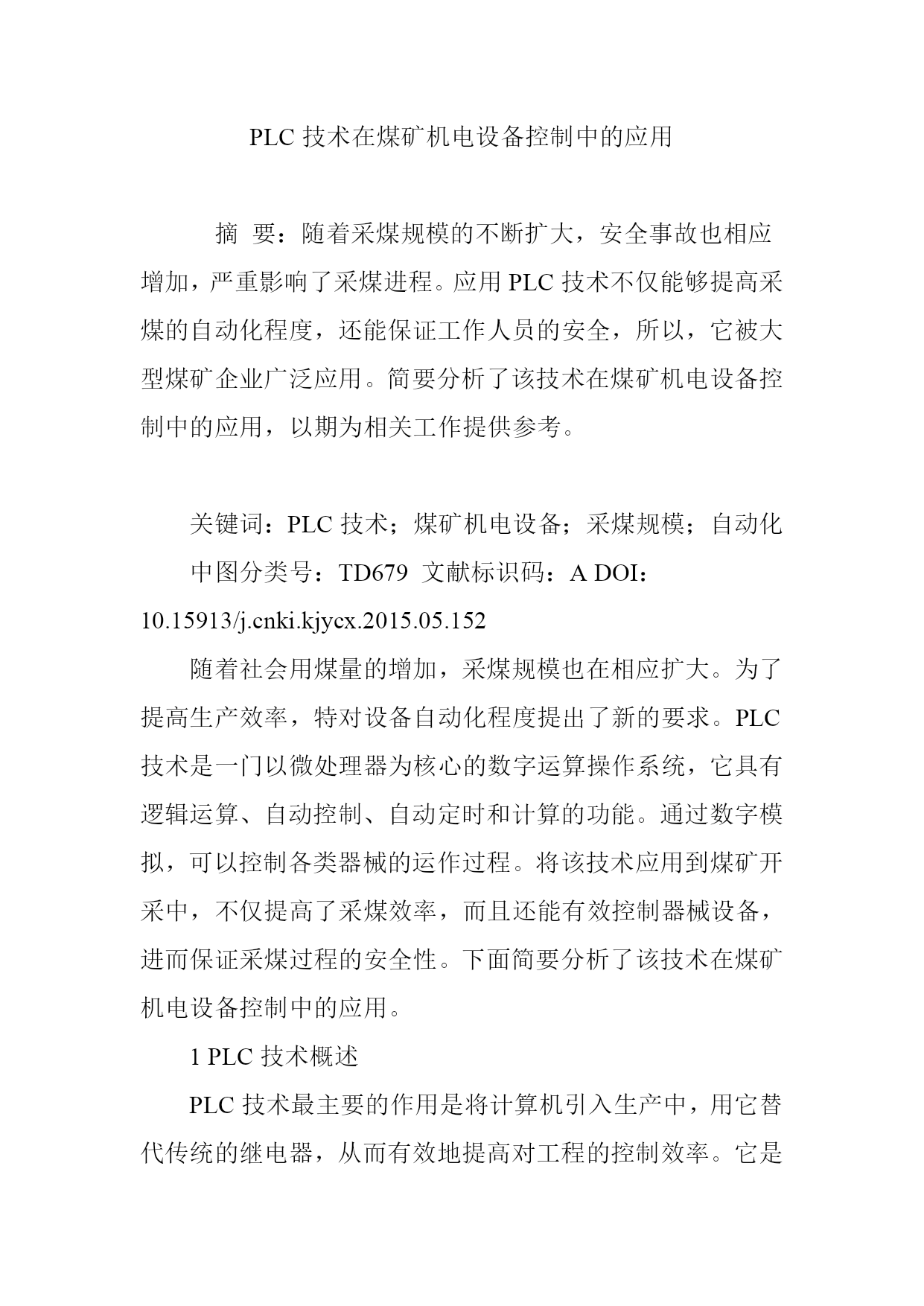 PLC技术在煤矿机电设备控制中的应用摘要:随着采煤规模的不断扩大,安全事故也相应增加,严重影响了采煤进程。应用PLC技术不仅能够提高采煤的自动化程度,还能保证工作人员的安全,所以,它被大型煤矿企业广泛应用。简要分析了该技术在煤矿机电设备控制中的应用,以期为相关工作提供参考。关键词:PLC技术;煤矿机电设备;采煤规模;自动化中图分类号:TD679文献标识码:ADOI:10.15913/j.cnki.kjycx.2015.05.152随着社会用煤量的增加,采煤规模也在相应扩大。为了提高生产效率,特对设备自动化