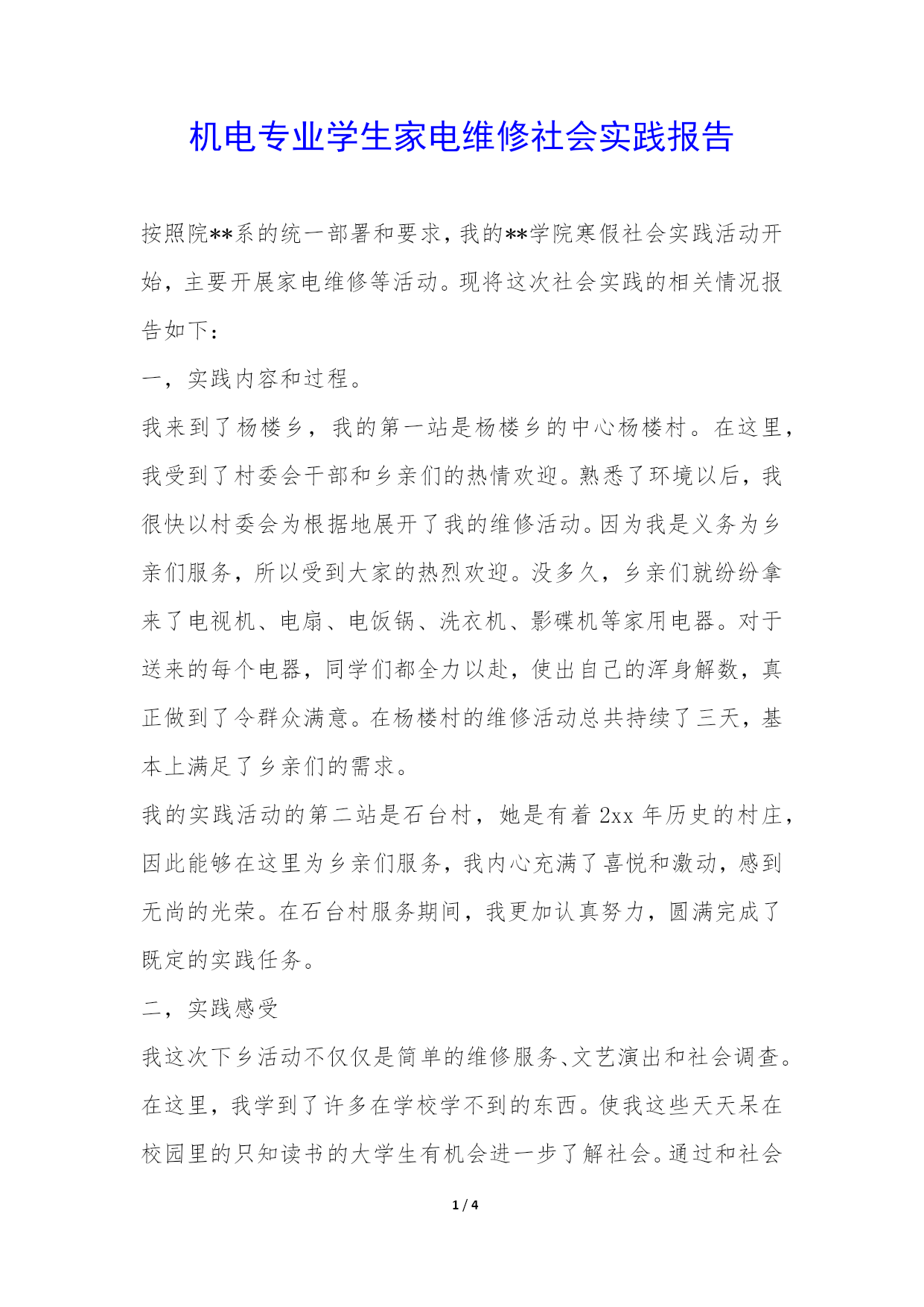 PAGE4/NUMPAGES4机电专业学生家电维修社会实践报告按照院**系的统一部署和要求,我的**学院寒假社会实践活动开始,主要开展家电维修等活动。现将这次社会实践的相关情况报告如下:一,实践内容和过程。我来到了杨楼乡,我的第一站是杨楼乡的中心杨楼村。在这里,我受到了村委会干部和乡亲们的热情欢迎。熟悉了环境以后,我很快以村委会为根据地展开了我的维修活动。因为我是义务为乡亲们服务,所以受到大家的热烈欢迎。没多久,乡亲们就纷纷拿来了电视机、电扇、电饭锅、洗衣机、影碟机等家用电器。对于送来的每个电