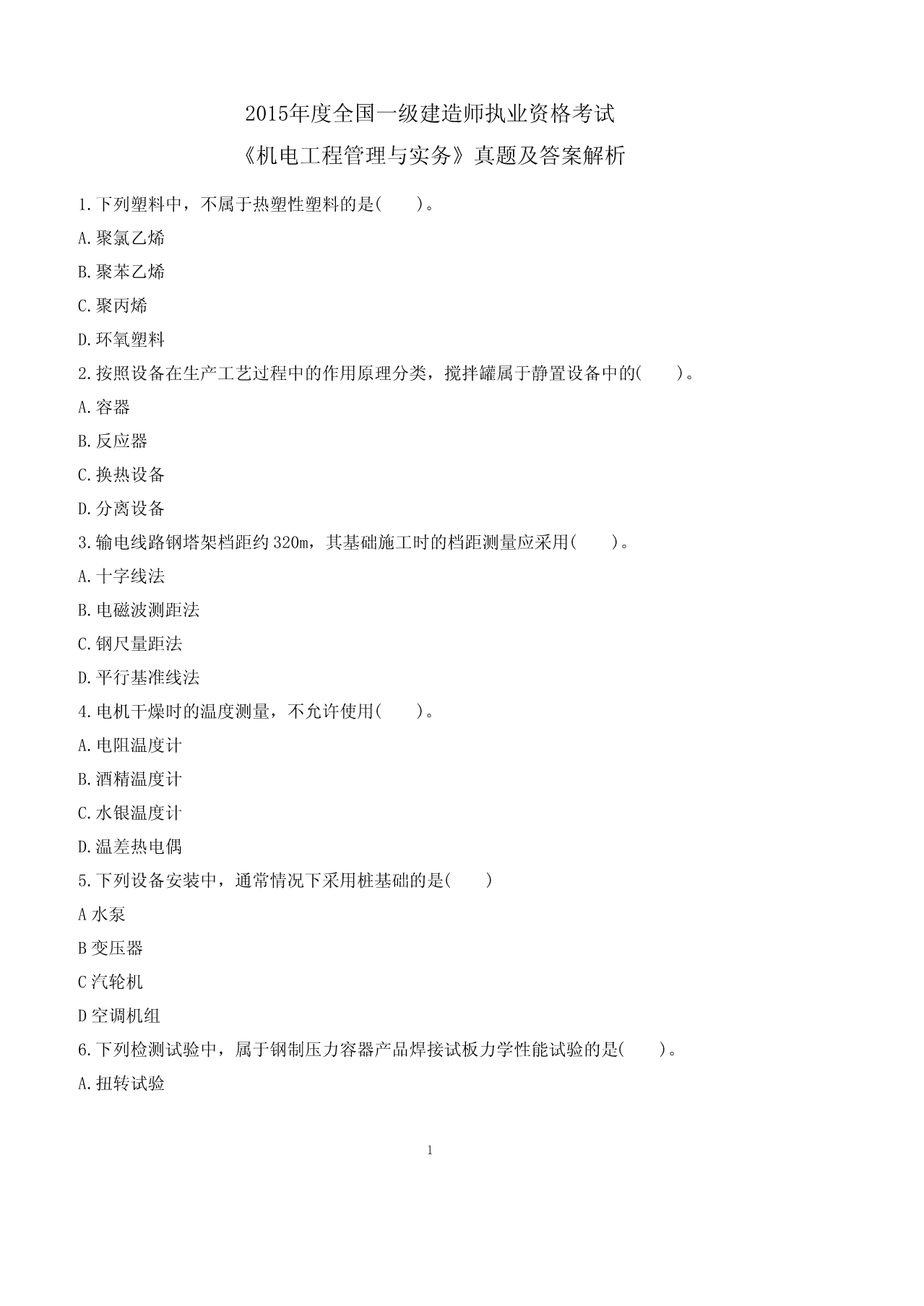 2015年度全国一级建造师执业资格考试《机电工程管理与实务》真题及答案解析1.下列塑料中,不属于热塑性塑料的是()。A.聚氯乙烯B.聚苯乙烯C.聚丙烯D.环氧塑料2.按照设备在生产工艺过程中的作用原理分类,搅拌罐属于静置设备中的()。A.容器B.反应器C.换热设备D.分离设备3.输电线路钢塔架档距约320m,其基础施工时的档距测量应采用()。A.十字线法B.电磁波测距法C.钢尺量距法D.平行基准线法4.电机干燥时的温度测量,不允许使用()。A.电阻温度计B.酒精温度计C.水银温度计D.温差热电偶5.下列设